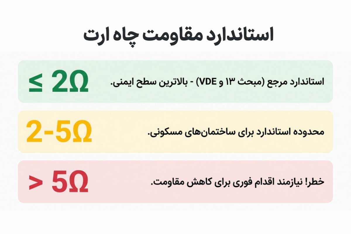 مقاومت چاه ارت ساختمان مسکونی باید بین ۲ تا ۵ اهم باشد تا مسیر ارت توانایی هدایت جریان نشتی و اتصال کوتاه را به زمین داشته باشد. معمولا مقاومت بین ۲ تا ۳ اهم ایدهآلترین مقدار برای مقاومت چاه ارت است، زیرا صحت عملکرد سیستم ارت را تضمین میکند. در واقع باید گفت که اگر مقاومت چاه ارت ساختمان بالاتر از ۵ اهم باشد، خطر برقگرفتگی افزایش پیدا میکند. در نتیجه برای ساختمانهایی که مقاومت آنها بیشتر از ۵ اهم است باید عمق چاه بیشتر شود یا تعداد میلههای ارت افزایش پیدا کند.