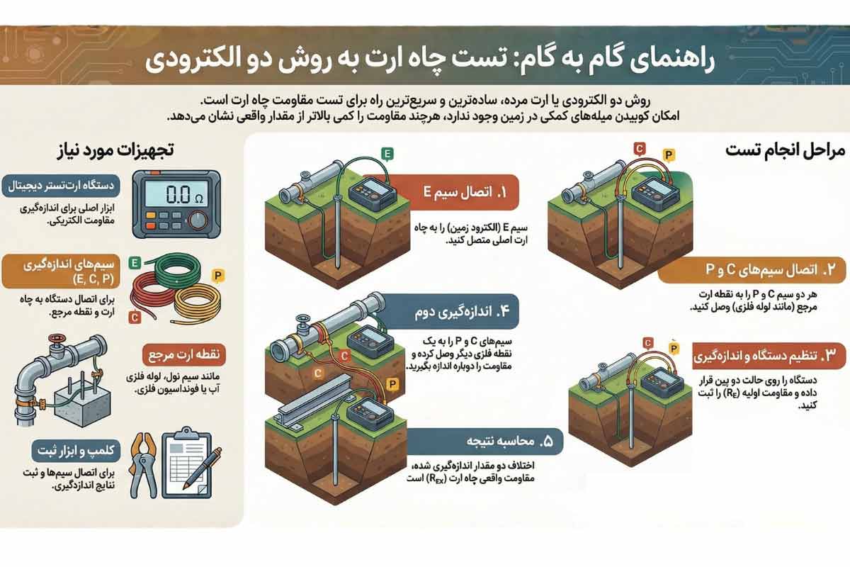 همچنین باید افزود که تست چاه ارت با لامپ بیشتر برای ساختمانهای مسکونی، دفاتر کوچک و محیطهای کمخطر مناسب است. برای تست چاه ارت در پروژههای صنعتی، دیتاسنترها، بیمارستانها و مکانهای حساس باید از روشهای دقیق و استاندارد مانند تست سهنقطهای یا روش شیب استفاده شود.