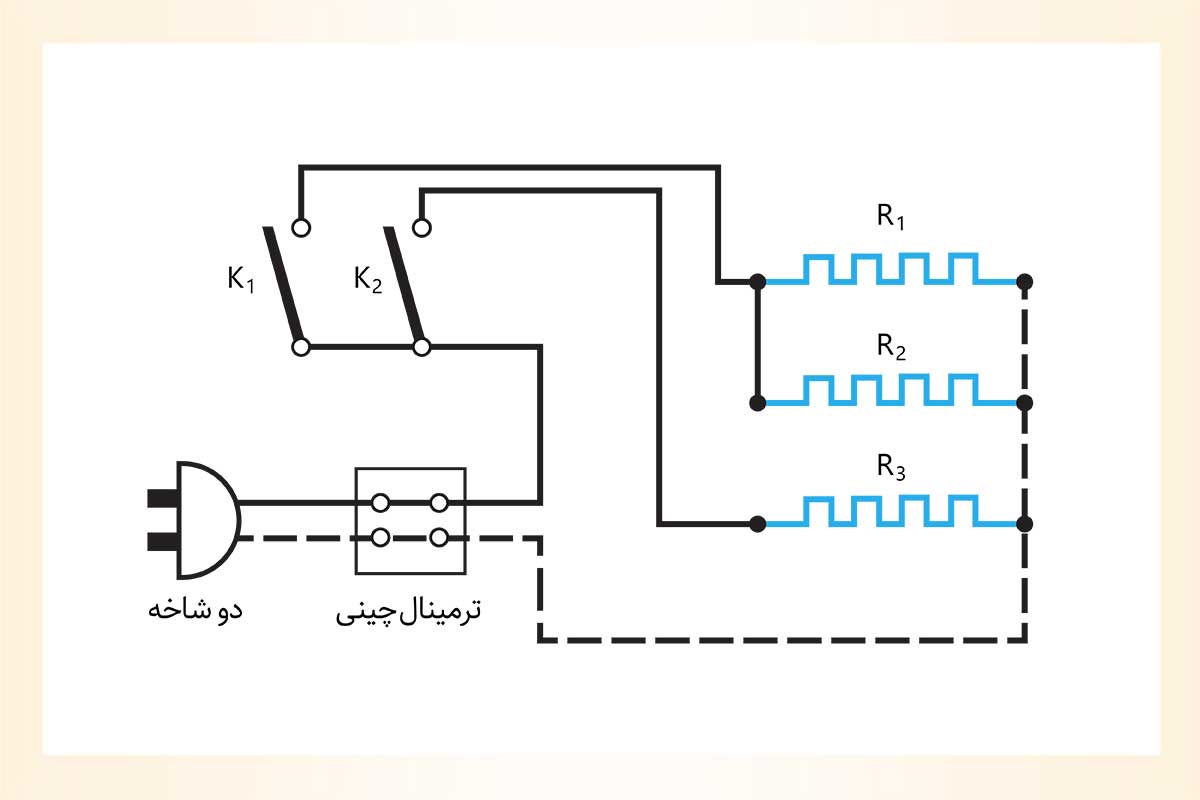 همانطور که در نقشه سیم کشی بخاری برقی دو شعله مشاهده میکنید؛ در این مدل هیترهای برقی پس از وصل شدن کلید، موتور و المنت R1 فعالیت خود را آغاز میکنند. به این صورت که در اثر چرخش موتور در المنتها حرارت به وجود میآید. سپس کلید دوم المنت R2 شروع به کار کرده و از این طریق حرارت بیشتری ایجاد میگردد.