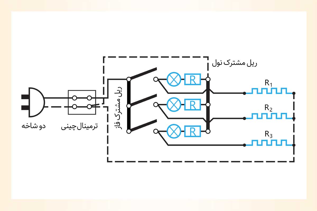 همانطور که نقشه سیم کشی بخاری برقی سه شعله با دو کلید را در زیر مشاهده میکنید؛ در این مدل از بخاریهای برقی بخشی به نام فن وجود ندارد. بنابراین فرآیند گرم کردن فضای داخلی منزل یا محل کار را سه المنت به کار رفته در دستگاه انجام میدهند. در مدارهایی که دارای سه المنت و دو کلید هستند، دو عدد از المنتها به صورت موازی با یکدیگر در بخاری تعبیه میشوند. این دو المنت در نهایت به یک کلید اتصال مییابند. المنت سوم هم به صورت موازی با دو المنت اول قرار میگیرد، سپس به کلید دوم وصل میشود.