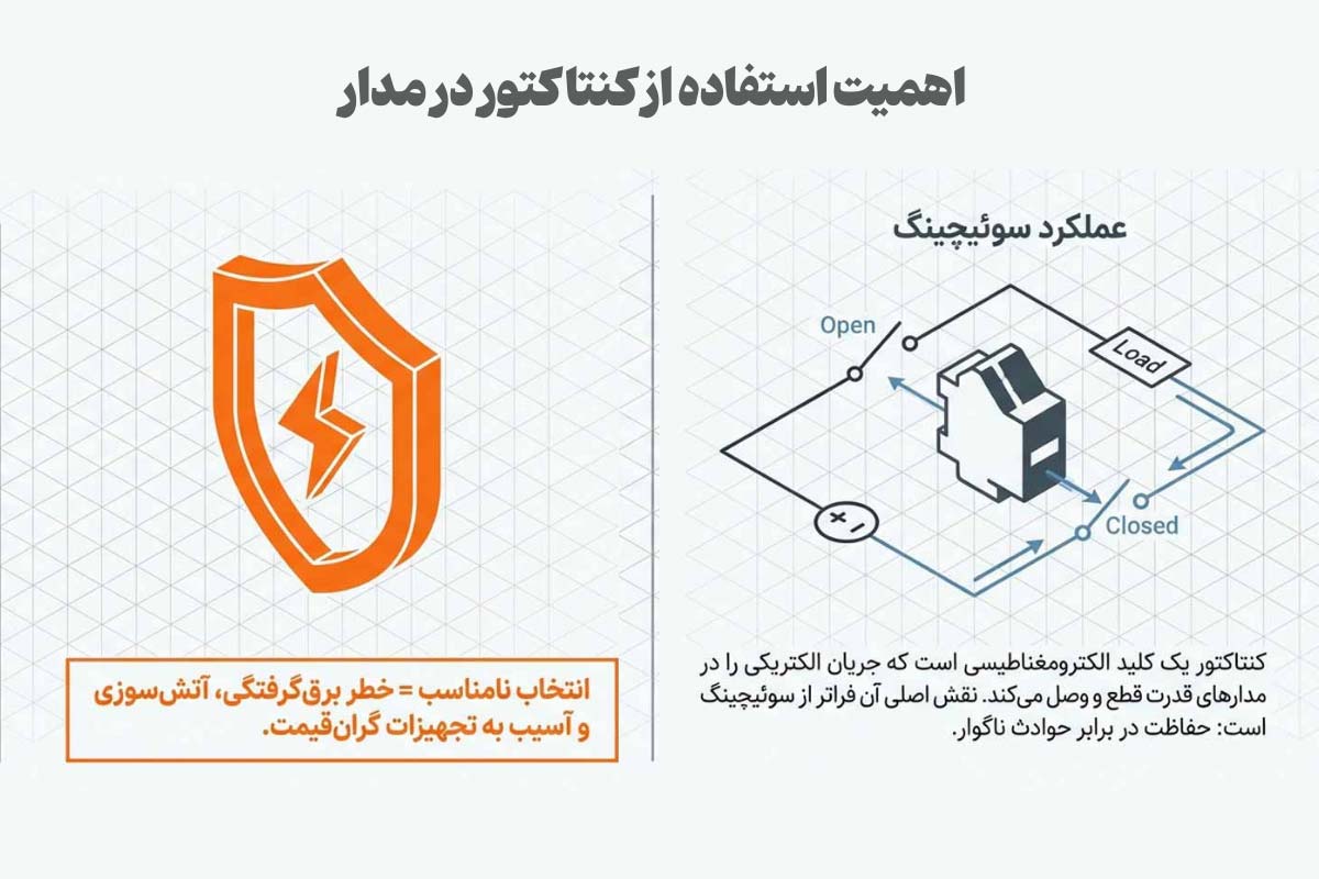 کنتاکتور یک نوع کلید الکترومغناطیسی است که نقش بسیار مهمی در حفاظت از مدارها و سیستم‌های الکتریکی دارد. چون این قطعه جریان الکتریکی را در مدارهای قدرت و سیستم‌های الکتریکی که جریان بالایی دارند، قطع و وصل می‌کند تا از بروز اتفاقات ناگوار مانند برق گرفتگی یا آتش‌سوزی جلوگیری شود.