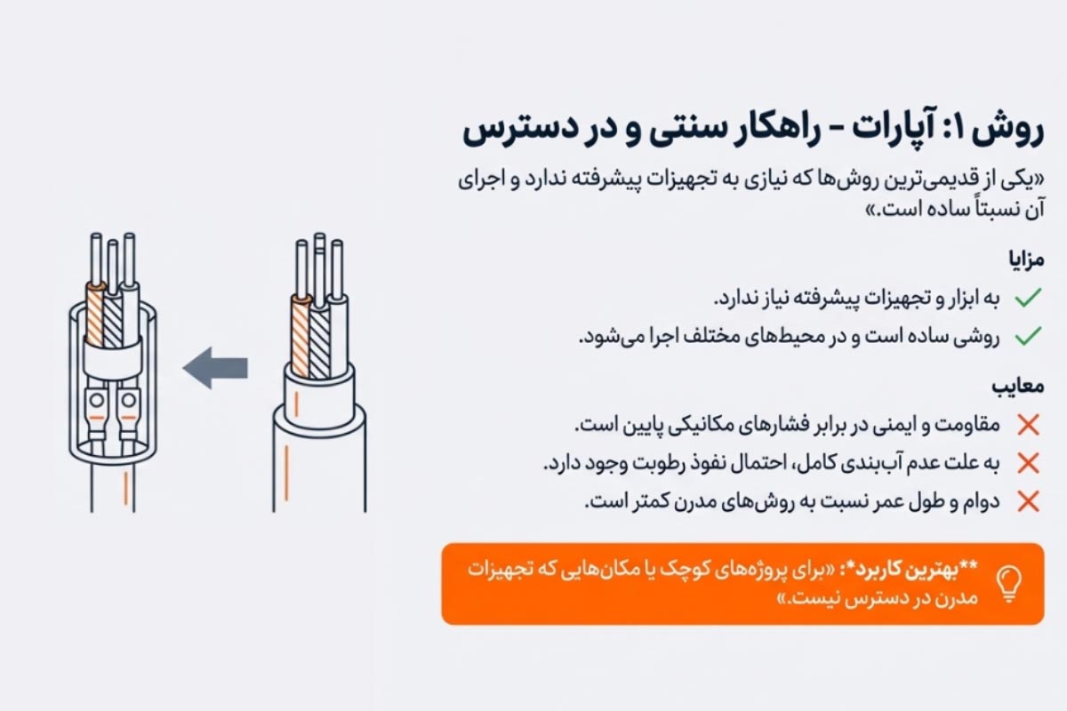 • سپس برای اتصال سیم‌ها، یک کدام از روش‌های زیر را اجرا می‌کنند: