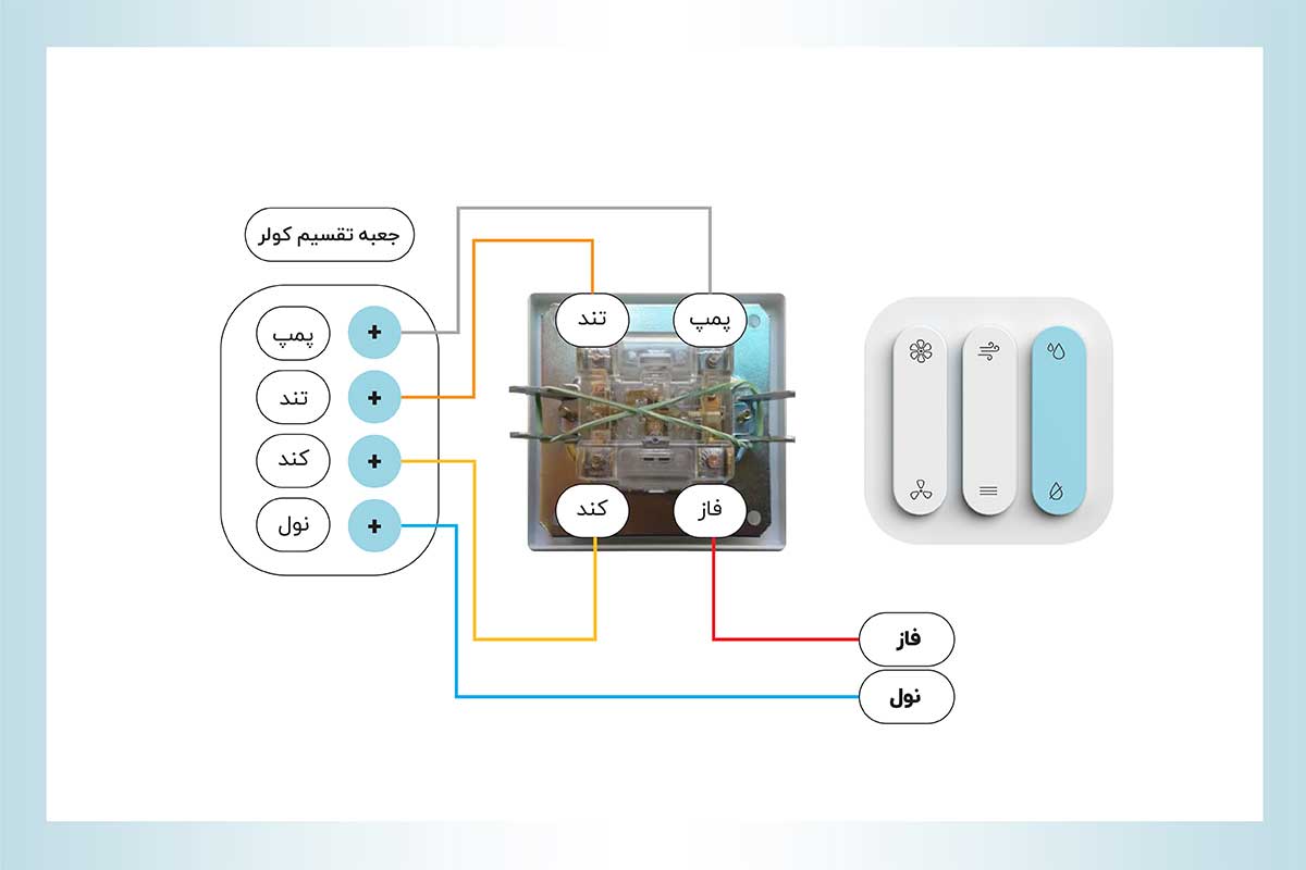 همانطور که در تصویر زیر میبینید، دو دسته سیم از موتور و پمپ کولر آبی خارج شده است و ضروری است که از طریق این سیمها بین جعبه تقسیم و پمپ و موتور ارتباط برقرار شود. جهت برقراری اتصال کولر آبی به برق، باید دسته سیم موتور را که شامل سیم نول، سیم دور تند و سیم دور کند است، به همان ترتیبی که در تصویر میبینید، در پیچهای مخصوص جعبه تقسیم قرار داد. دسته دوم سیمها یا سیمهای پمپ آب کولر نیز حاوی سیم نول و سیم پمپ است و مطابق تصویر، آنها در نقاط مخصوص قرار میگیرد.