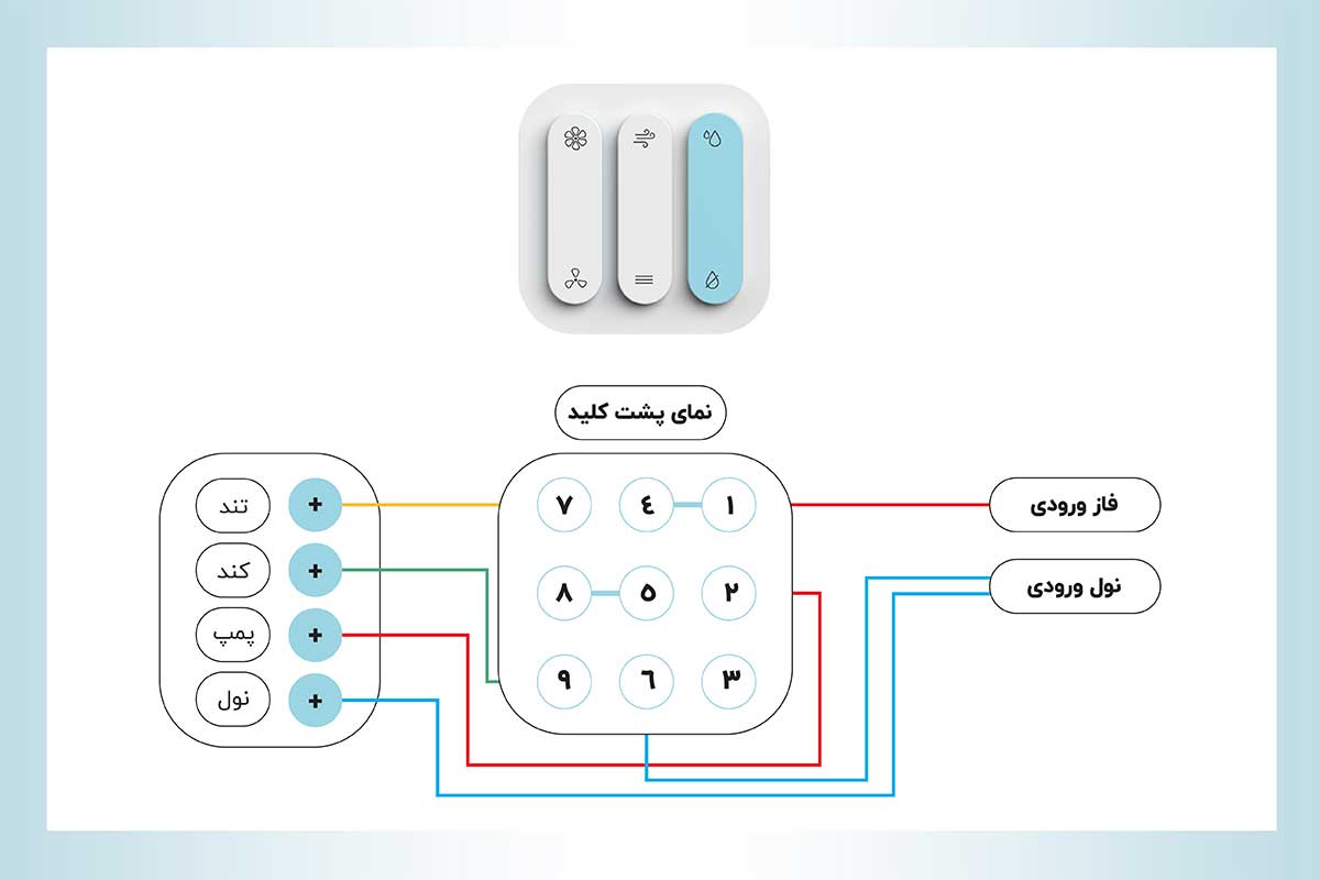 بر اساس عکس زیر، سیم دور تند را از پیچ تند به ترمینال ۷ کلید و سیم دور کند باید از پیچ تند به ترمینال ۹ وصل شود. سیم سبز یا همان سیم مخصوص پمپ هم از پیچ مخصوص پمپ به ترمینال شماره ۲ و سیم نول یا سیم آبی هم به ترمینال شماره ۶ کلید متصل میشود.