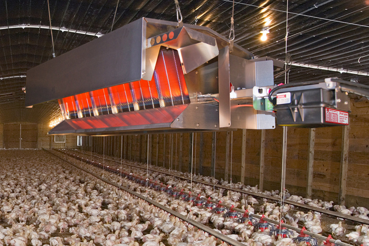 یکی از منحصر به فردترین سیستمهای گرمایش مرغداری که در کشورهای پیشرفته مورد استفاده قرار میگیرد؛ سیستم ساطع کننده اشعه مادون قرمز است. استفاده از این سیستم بهواسطه صرفهجویی در مصرف انرژی، کاهش هزینههای مالی و تاثیر در رشد بهتر جوجهها، رایج شده است. اشعه مادون قرمز از طریق یک نوع فلز خاص به کار رفته در ساخت لولههای این سیستم گرمایشی تولید میشود. سپس به کمک صفحههای انعکاسدهنده به محیط مورد نظر منتقل خواهد شد. گرمای ساطع شده از این سیستم به همه نقاط محیط منتقل میشود. همچنین گرما به پشت جوجهها منتقل شده و شرایطی مشابه حضور مادر برای آنها فراهم خواهد شد.
