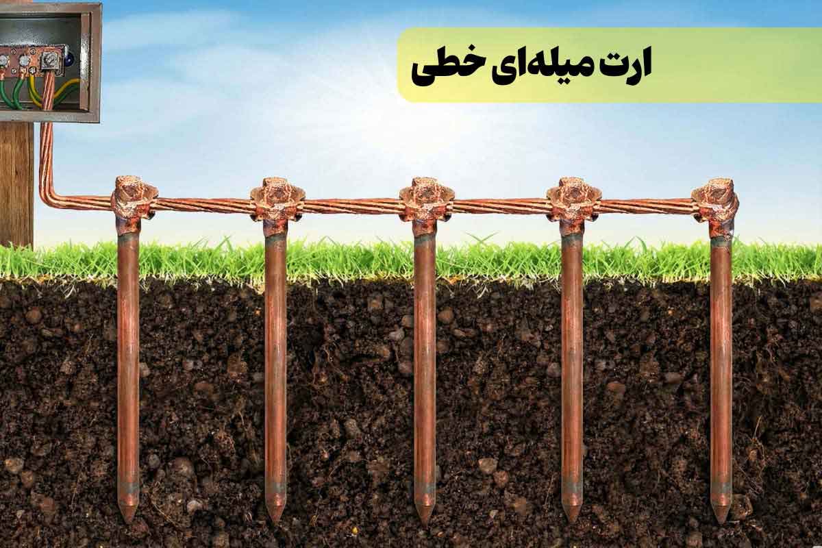 در روش اجرای ارت میلهای خطی، میلهها بهشکل خطی و در یک راستا داخل زمین قرار میگیرند. در نتیجه این روش، برای فضاهای محدود که خاک یکنواختی دارند بسیار مناسب است و در کمترین زمان ممکن انجام میشود.