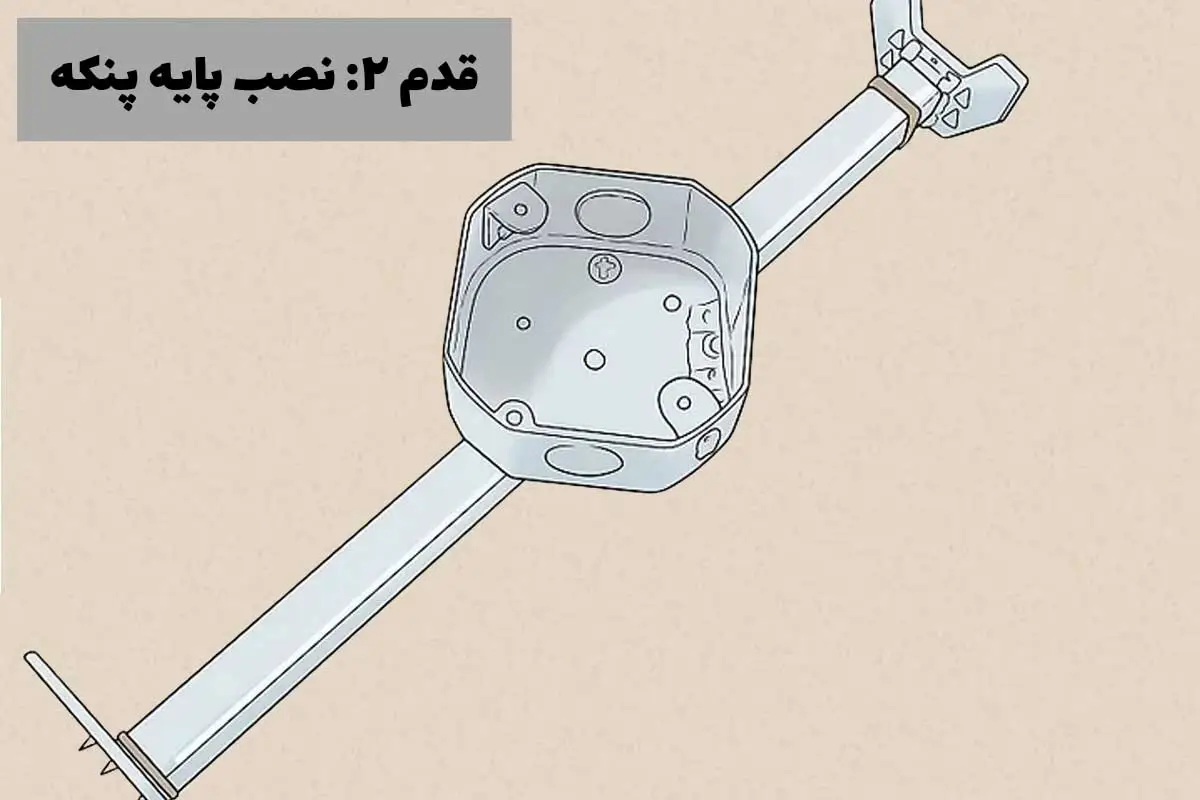 در مرحله دوم باید پایه پنکه به سقف نصب شود. زیرا پایه امکان نصب جعبه تقسیم برق را میان سقف و پنکه به شما میدهد. پس از نصب پایه، باید سیم برق از جعبه تقسیم چراغ خارج شده و وارد جعبه تقسیم پایه شود. پوشاندن جعبه تقسیم قدیمی نیز یکی از مراحل نصب به حساب میآید. برای این کار معمولا از روکشهای 101 میلیمتری استفاده میشود.