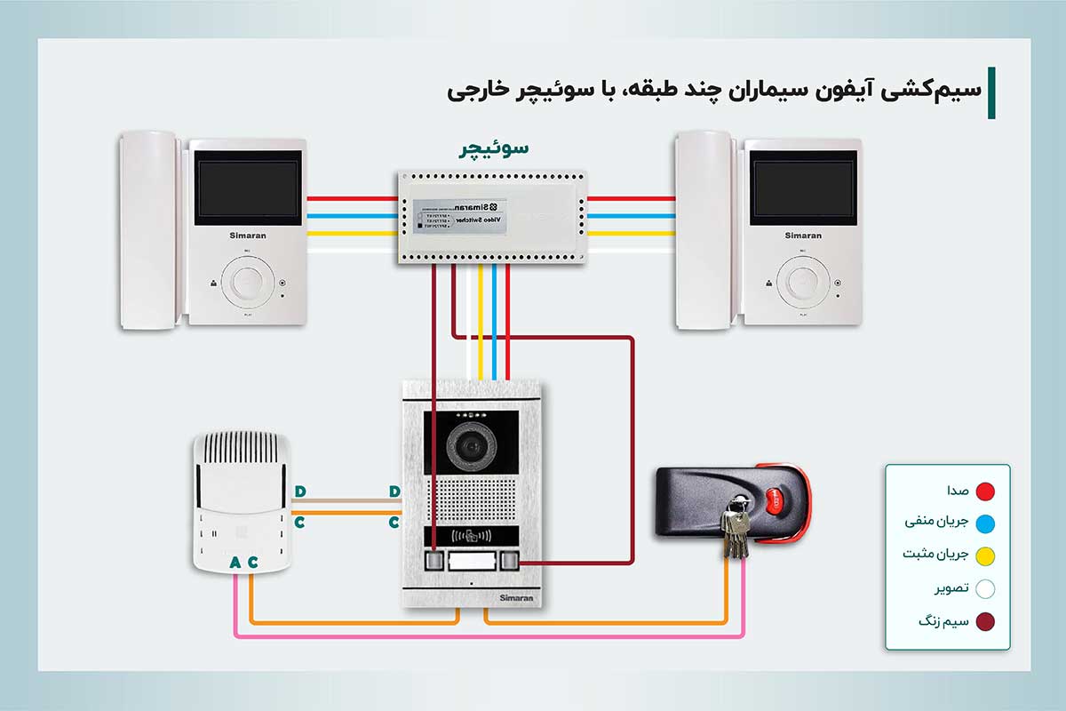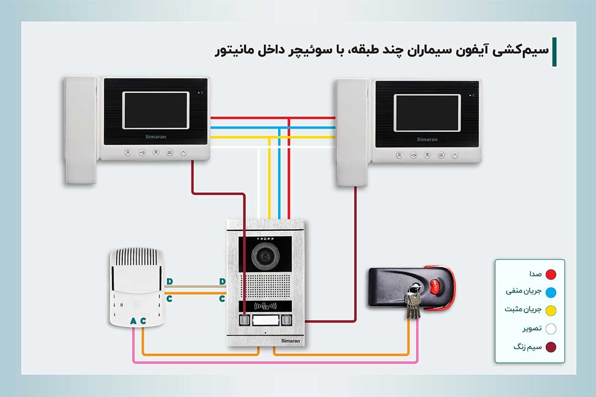 نحوه سیمکشی آیفونهای تصویری چند طبقه برند سیماران که داخل مانیتور خود سوئیچر داخلی دارند به شرح زیر است: