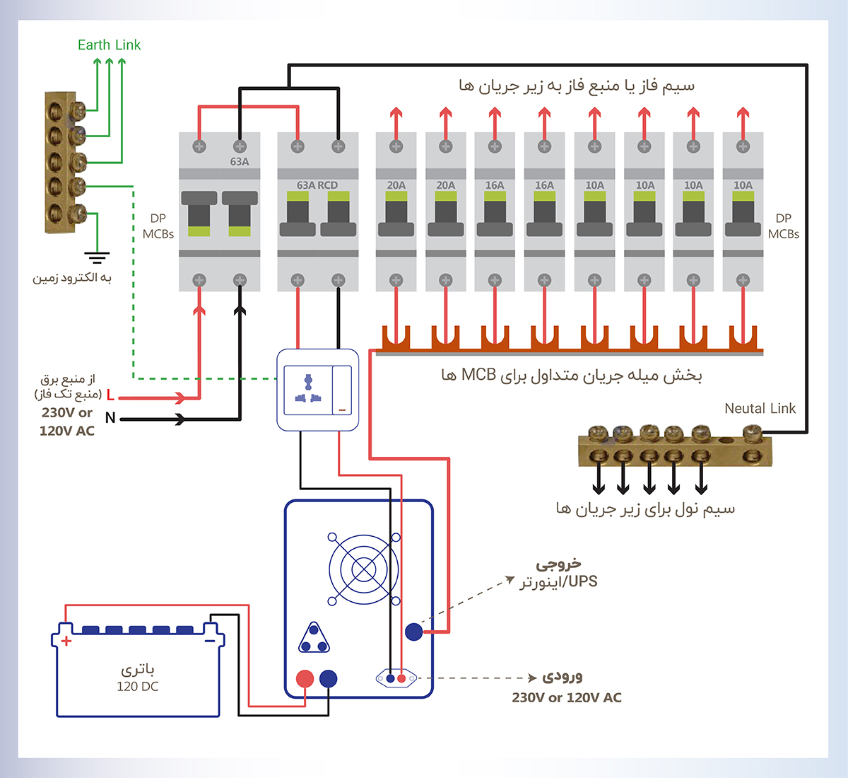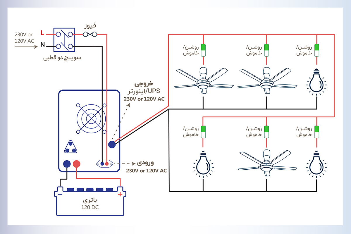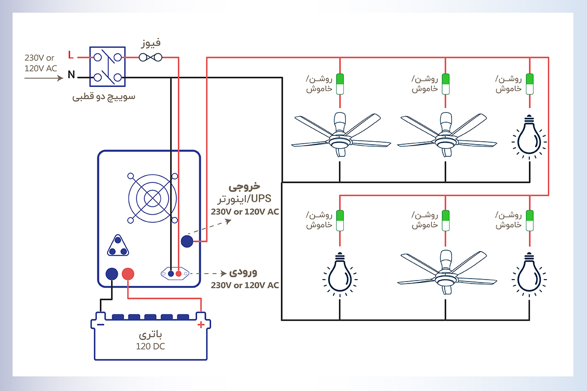 برای اتصال یو پی اس به لوازم و دستگاههای برقی با اتصال یک سیم فاز فرعی باید یک کار مهم انجام دهید. مطابق با نقشه این نوع سیمکشی باید سیم فاز فرعی را به وسایلی که قبلاً به دو سیم فاز و نول متصل شدهاند، وصل کنید. مطابق با این نوع نقشه سیمکشی نیازی به اتصال سیم فاز فرعی به یو پی اس ندارید. در واقع برای نصب یو پی اس مطابق با این روش سیمکشی فقط به یک سیم فاز نیاز دارید.