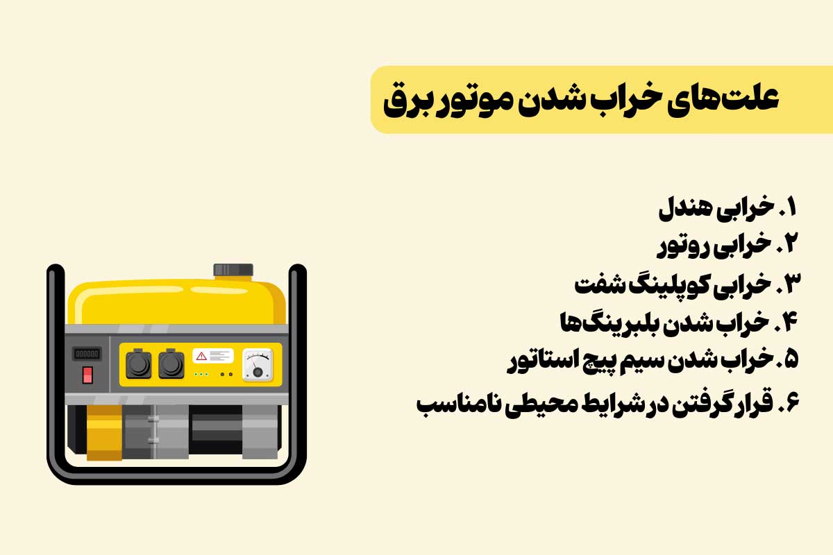 بر همین اساس در ادامه این مقاله، درباره آموزش تعمیر موتور برق بنزینی، علت برق ندادن ژنراتور گازوئیلی، علت کم شدن ولتاژ موتور برق، علت روغن ریزی موتور برق و… صحبت خواهیم کرد تا در زمان خرابی موتور برق بتوانید آن را تعمیر کنید.