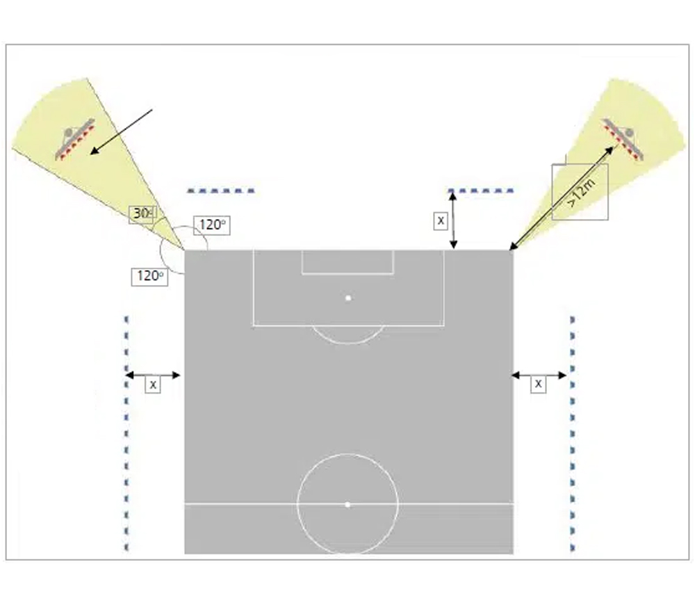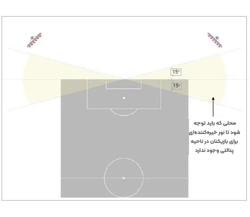 | پشت خط دروازه – محل نصب لامپ | ![]() | برای نورپردازی پشت محل دروازه، پروژکتورها باید در لبهای با زاویه بیش از 60 درجه از خط دروازه نصب شوند. چرا که زاویه کمتر به معنای ارتفاع نصب کمتر از دروازه بوده و باعث ایجاد نوری خیرهکننده برای بازیکنان میشود. |