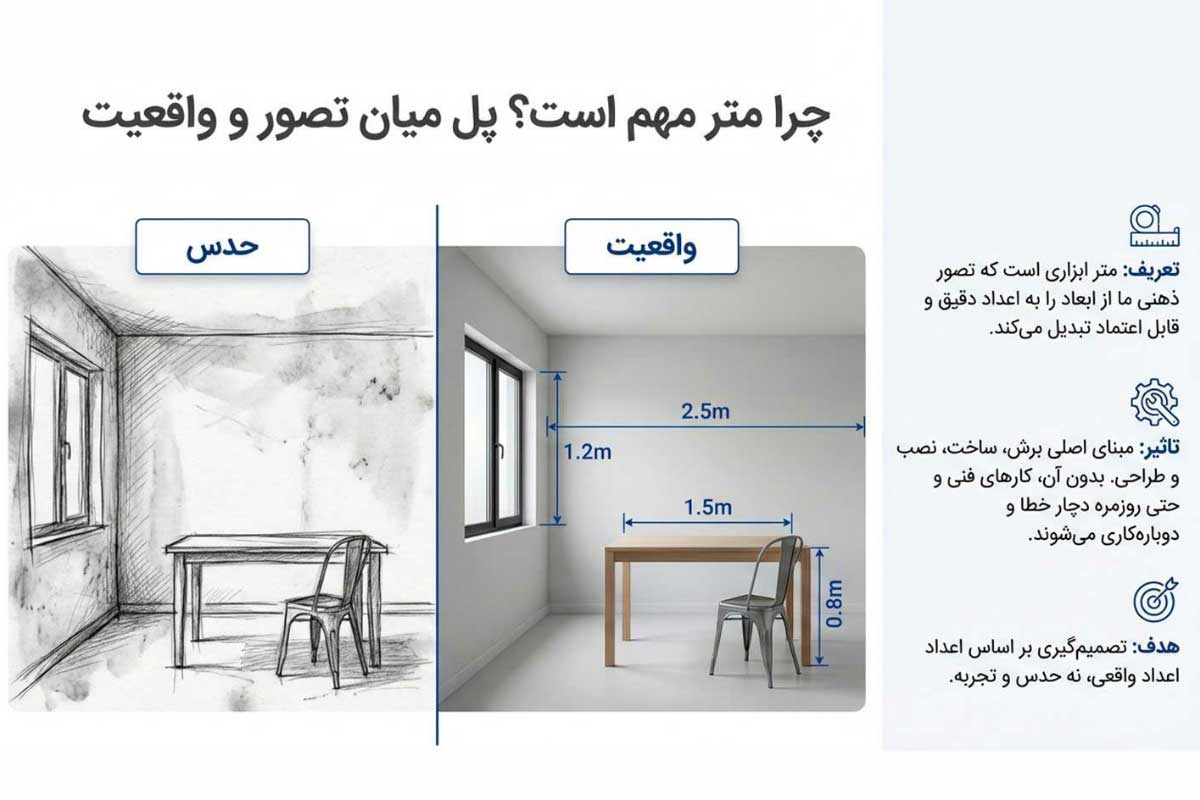 در واقع متر ابزاری است که دقت را وارد کار میکند و باعث میشود تصمیمها بر اساس عدد و اندازه واقعی گرفته شوند، نه حدس و تجربه.