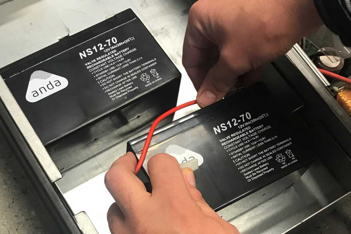 در نصب باتری یو پی اس به صورت سری – موازی، هم ولتاژ و هم ظرفیت کلی باتریها افزایش مییابد که در نتیجه بکاپ تایم بیشتری داریم و جریان بیشتری برای دستگاههای متصل به یو پی اس وجود دارد. تعداد باتریها در این روش بیشتر از نصب باتری به صورت سری و موازی است و آنها را معمولا در کابینت باتری یو پی اس یا رک میگذارند. به تصویر زیر که نصب باتری یو پی اس به روش سری – موازی است، نگاه کنید.
