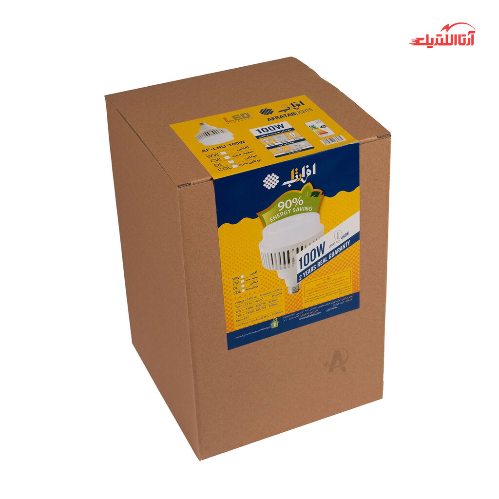 لامپ 100 وات ال ای دی کارگاهی افراتاب پایه E40 مدل AF-LNU-100 محصولی پرنور و مناسب محیطهایی با سقف بلند و محیطهای صنعتی و هر کاربرد دیگری که نیاز به نور بسیار دارد، است. شدت روشنایی این لامپ در رنگ نور آفتابی معادل 10800 لومن و در رنگ نور مهتابی 11000 لومن است. سرپیچ لامپ نوع E40، بزرگ، است. در ساخت بدنه این محصول از مواد پلاستیکی استفاده شده است. لامپ 100 وات ال ای دی افراتاب بسیار کم مصرف (رده انرژی A+) است و عمر تقریبی 25000 ساعت دارد.