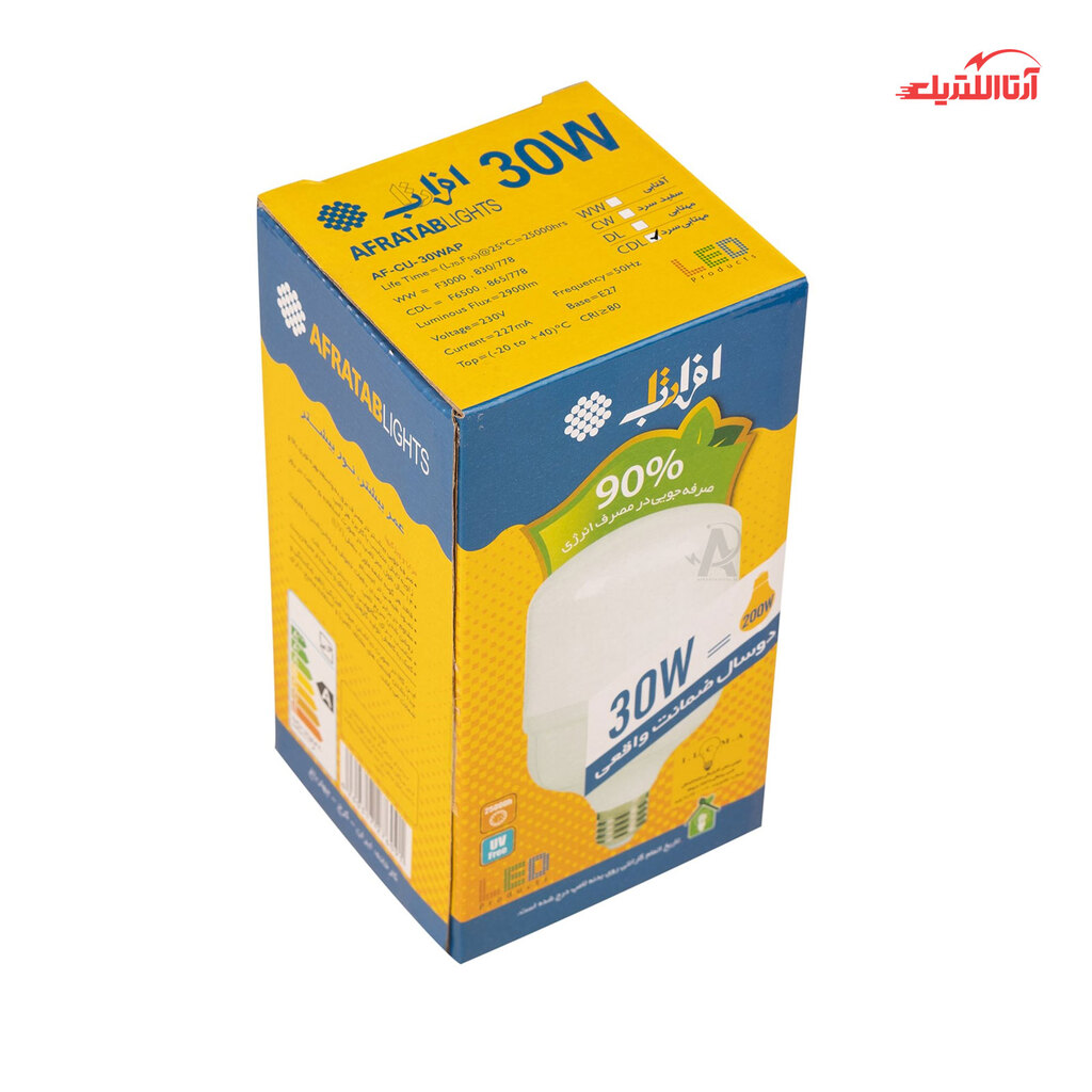 لامپ ال ای دی 30 وات استوانه افراتاب مدل AF-CU-30WAP روشنایی معادل 200 وات لامپ‌های رشته‌ای دارد. شدت روشنایی لامپ استوانه در رنگ نور آفتابی معادل 2700 لومن و در رنگ نور مهتابی برابر 2900 لومن است. سرپیچ این محصول E27 است، سرپیچ معمولی و مناسب نورپردازی منازل و ادارات است. در ساخت بدنه این محصول از مواد پلاستیکی استفاده شده و نشکن است. 30 وات ال ای دی افراتاب بسیار کم مصرف (رده انرژی A+) و وزن آن 350 گرم و در ابعاد 18در10 سانتی‌متر ساخته می‌شود. با توجه به بهره‌گیری از تکنولوژی ال ای دی SMD در محصول، دارای طول عمر تقریبی 25000 ساعت است. زاویه تابش این مدل 230 درجه است.