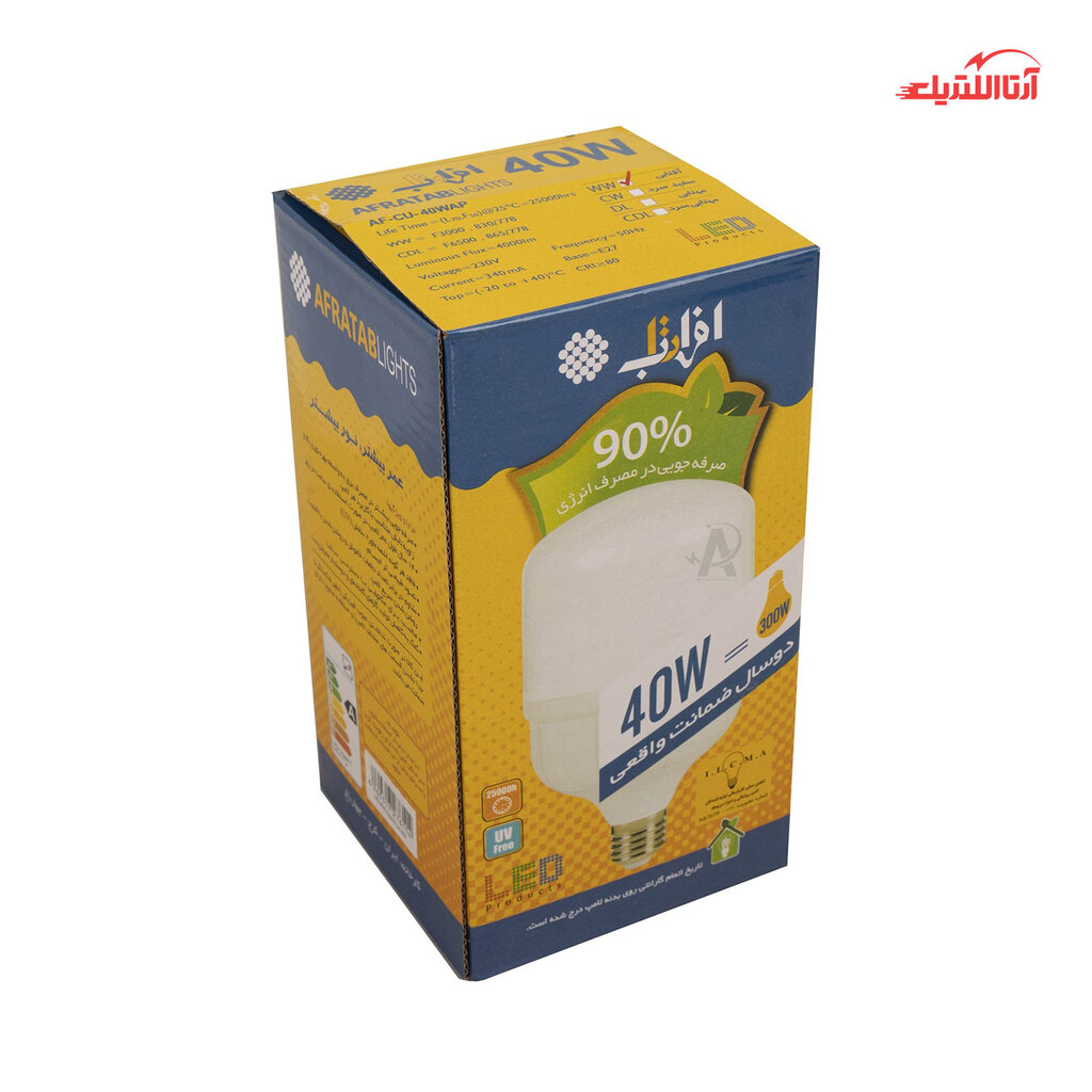لامپ ال ای دی 40 وات استوانه افراتاب مدل AF-CU-40WAP روشنایی معادل 350 وات لامپ‌های رشته‌ای دارد. شدت روشنایی لامپ استوانه در رنگ نور آفتابی معادل 4000 لومن و در رنگ نور مهتابی برابر 4200 لومن است. سرپیچ این محصول E27 است، سرپیچ معمولی و مناسب نورپردازی منازل و ادارات است. در ساخت بدنه این محصول از مواد پلاستیکی استفاده شده و نشکن است. 40 وات ال ای دی افراتاب بسیار کم مصرف (رده انرژی A+) و وزن آن 350 گرم و در ابعاد 20در12 سانتی‌متر ساخته می‌شود. با توجه به بهره‌گیری از تکنولوژی ال ای دی SMD در محصول، دارای طول عمر تقریبی 25000 ساعت است. زاویه تابش این مدل 230 درجه است.