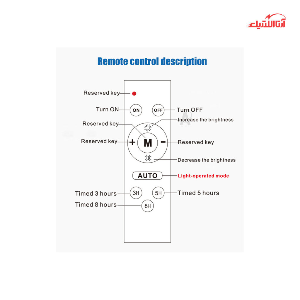 این مدل دارای یک ریموت کنترل است، که با استفاده از آن می‌توان پروژکتور را خاموش و روشن و در حالت‌های مختلفی تنظیم کرد. برای برقراری اتصال بین چراغ و پنل یک سیم ضدآب تعبیه شده است. هنگام استفاده از پنل توجه داشته باشید که در معرض نور مستقیم خورشید نصب شود و در اطراف آن منابع نور مصنوعی نباشد. چراغ محصول در ابعاد 55×64 سانتی‌متر ساخته می‌شود. زمان لازم برای شارژ کامل پنل 8 الی 6 ساعت و ماکسیسم زمان نوردهی چراغ 8 الی 12 ساعت است.
