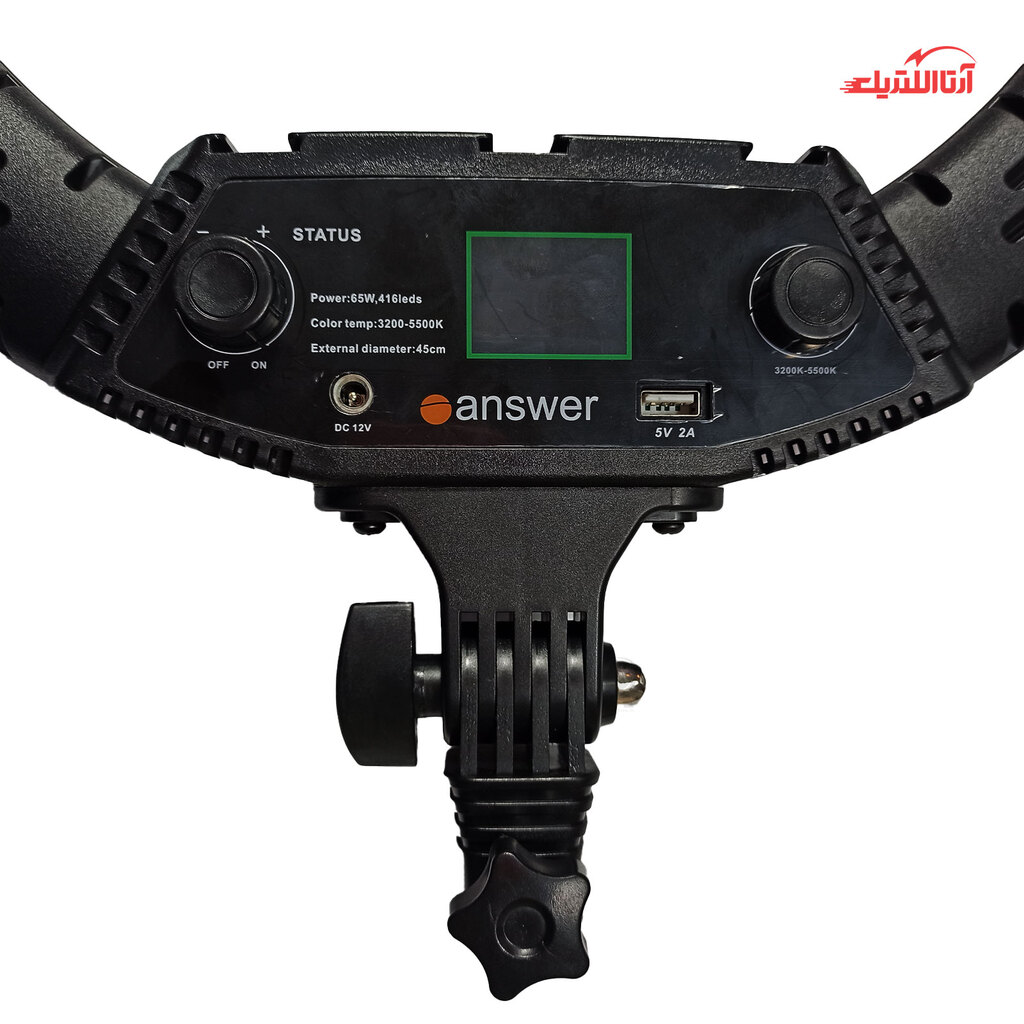 رینگ لایت 18 اینچی answer در کنار خود یک رینگ لایت کوچکتر 10 اینچی هم دارد که به وسیله درگاه USB که در پشت رینگ لایت اصلی روشن و امکان استفاده به وسیله دوشاخههای شارژ که خروجی USB دارد می توان با توجه به ولتاژ از رینگ لایت استفاده کرد.از موارد خاص دیگر این رینگ لایت وجود یک نمایشگر دیجیتال است برای نمایش میزان روشنایی یا نور ساطع شده از رینگ لایت و نمایش دمای رنگ نور که میتوانید دقیقا عدد رنگ نور مورد نظر خود را تنظیم کنید.