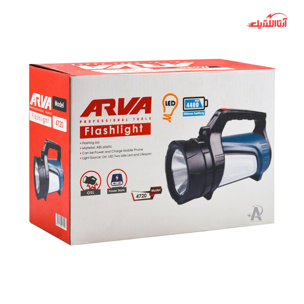 چراغ قوه دستی آروا مدل 4720 دارای چراغ چشمک زن است. بدنه این محصول از جنس ABS ساخته شده که جزء پلاستیکهای گرمانرم بوده و دارای ساختاری آمورف است. شما میتوانید از این محصول به علت سبک بودن وزن، که 164 گرم است، در هر شرایطی استفاده کنید. مقاومت بسیار بالای این چراغ قوه باعث میشود که در برابر ضربات احتمالی از آسیب رسیدن به آن جلوگیری شود. این محصول دارای لامپ ال ای دی با تکنولوژی OSL است که برای ایجاد بالاترین حد روشنایی دوطرفه استفاده میشود، همچنین 500 لومن بودن روشنایی این چراغ باعث میشود این محصول علاوه بر کارهای روزمره برای کارهای فنی و تکنیکی، ماهیگیری، شکار و.. نیز کاربرد داشته باشد. از ویژگی های این محصول می توان به ظرفیت باتری 4400 میلی آمپر بر ساعت آن اشاره کرد. همچنین شما میتوانید از آن به عنوان پاور بانک برای شارژ کردن موبایل در هر مکانی استفاده کنید.