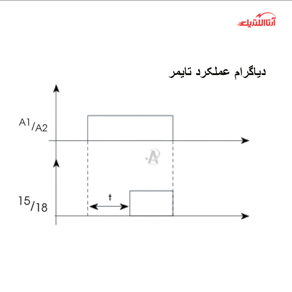 با وصل شدن تغذیه به ترمینالهای A1 و A2، سیگنال PWR فعال شده و فرآیند زمانسنجی آغاز میشود.پس از پایان زمان تنظیمشده، سیگنال OUT فعال شده و رله داخلی عمل میکند، در نتیجه ترمینال 15 به 18 متصل میشود.تا زمانی که ولتاژ تغذیه برقرار بوده و بیش از 40ذرصد کاهش نیابد، خروجی بدون تغییر باقی میماند.با قطع شدن برق، سیگنال OUT غیرفعال شده و رله داخلی به حالت اولیه بازمیگردد و برای زمانسنجی مجدد آماده میشود. در این حالت، ترمینال 15 به 16 متصل میگردد