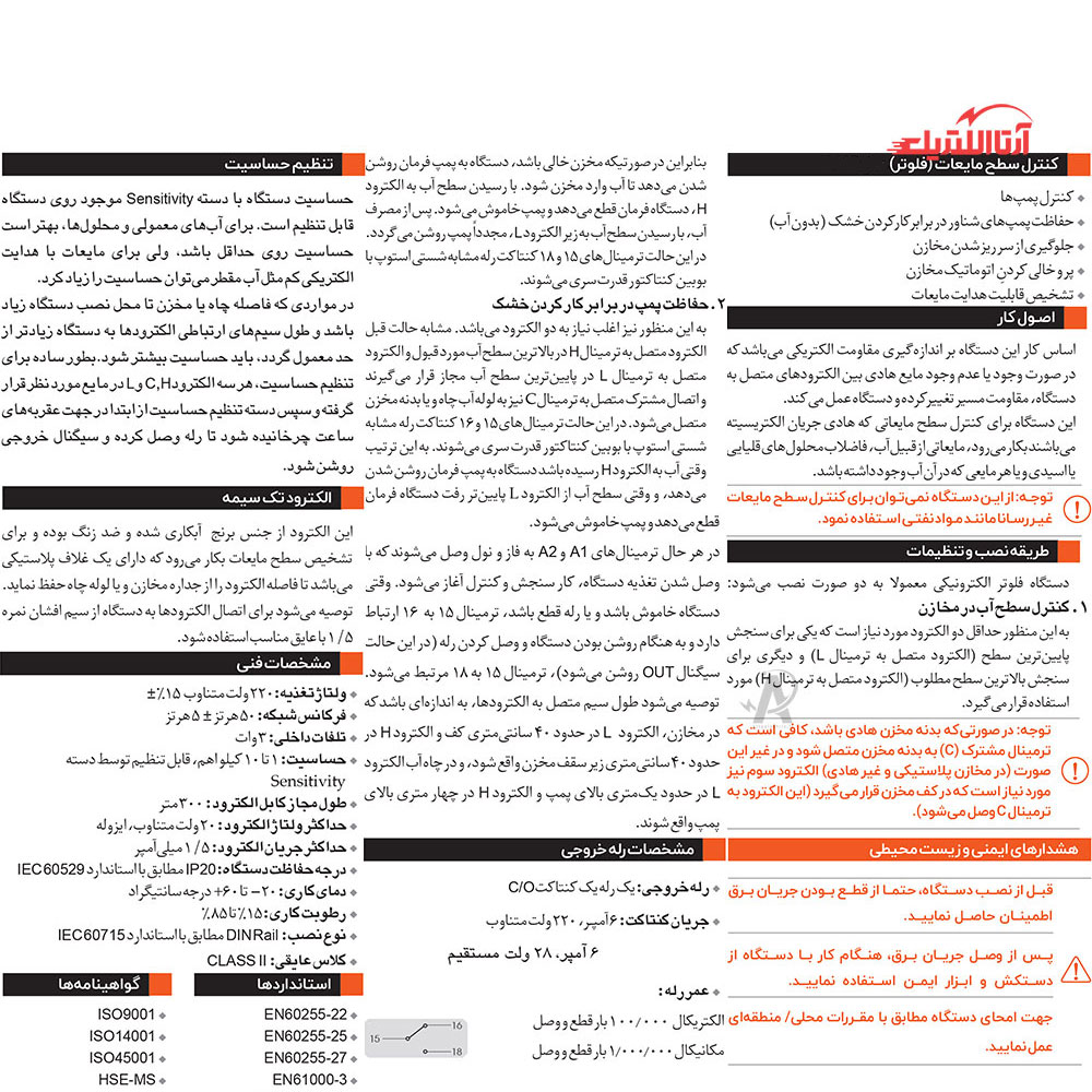 این الکترود که از برنج آبکاری شده و ضد زنگ ساخته شده است، برای تشخیص سطح مایعات استفاده می‌شود و به منظور حفظ فاصله آن از جداره مخازن یا لوله چاه، با یک غلاف پلاستیکی پوشانده شده است.همچنین پیشنهاد می‌شود برای اتصال الکترودها به دستگاه از سیم افشان نمره 1.5 با عایق مناسب استفاده گردد.