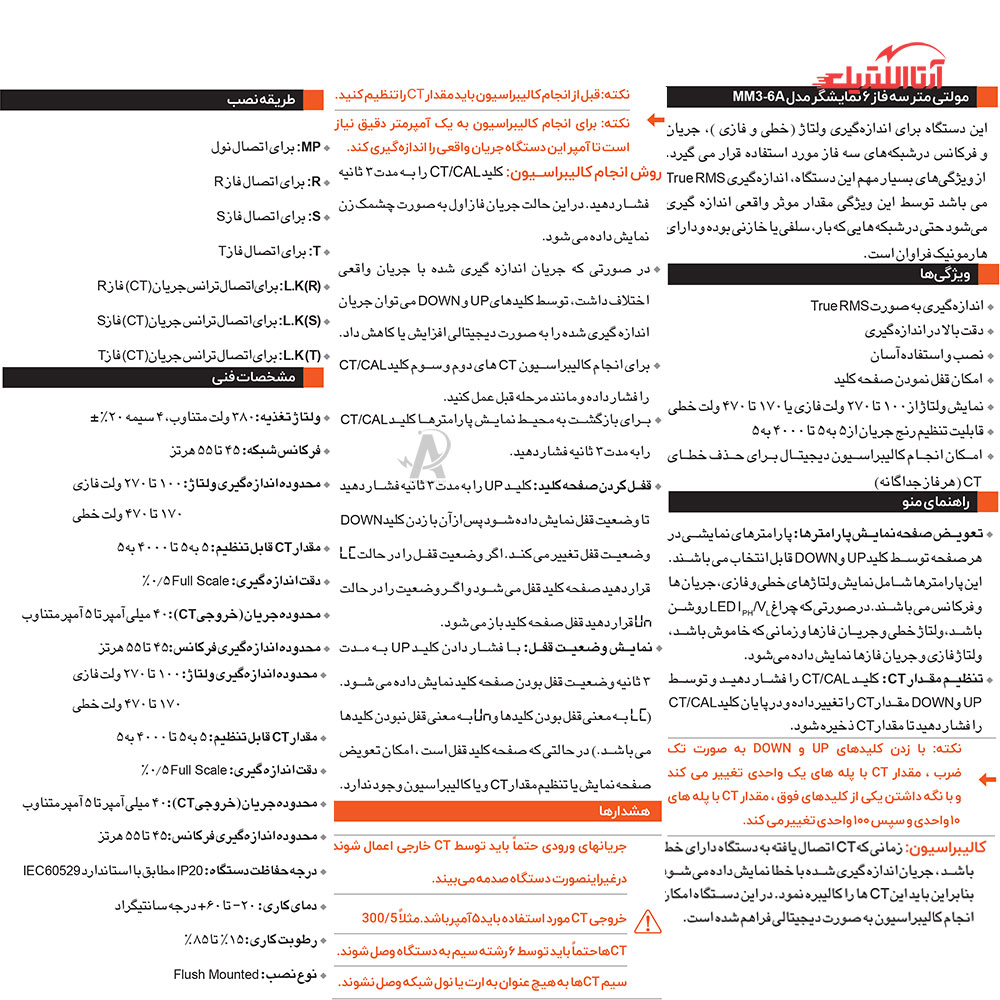 | محدوده جریان (خروجی CT) | ۴۰ میلی آمپر تا ۵ آمپر متناوب |