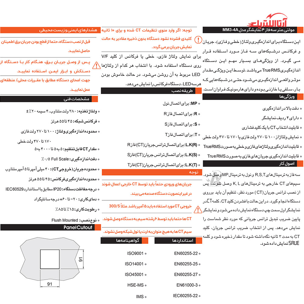 | محدوده جریان (خروجی CT) | ۴۰ میلی آمپر تا ۵ آمپر متناوب |