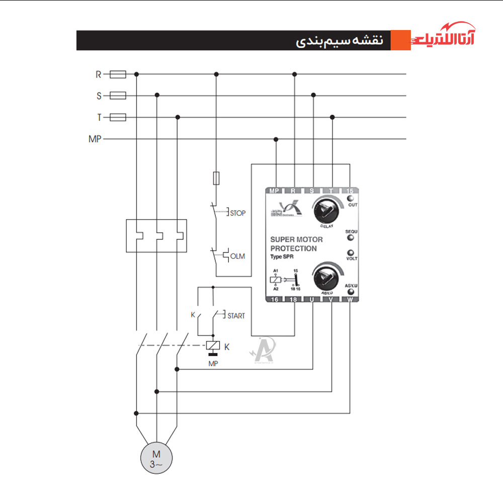 - بــا اتصال ســه فاز اصلی و نول بــه ترمینالهــای T, S, R و MP در صورتیکه ســه فاز شبکه متقارن باشند، ولتاژ در حد استاندارد و ترتیــب فازها نیــز صحیح باشــند پــس از تأخیر تنظیم شــده توســط دســته DELAY رله عمــل میکنــد، (کنتاکــت 15 به 18 وصل میگردد) و سیگنال OUT روشن می شود.
