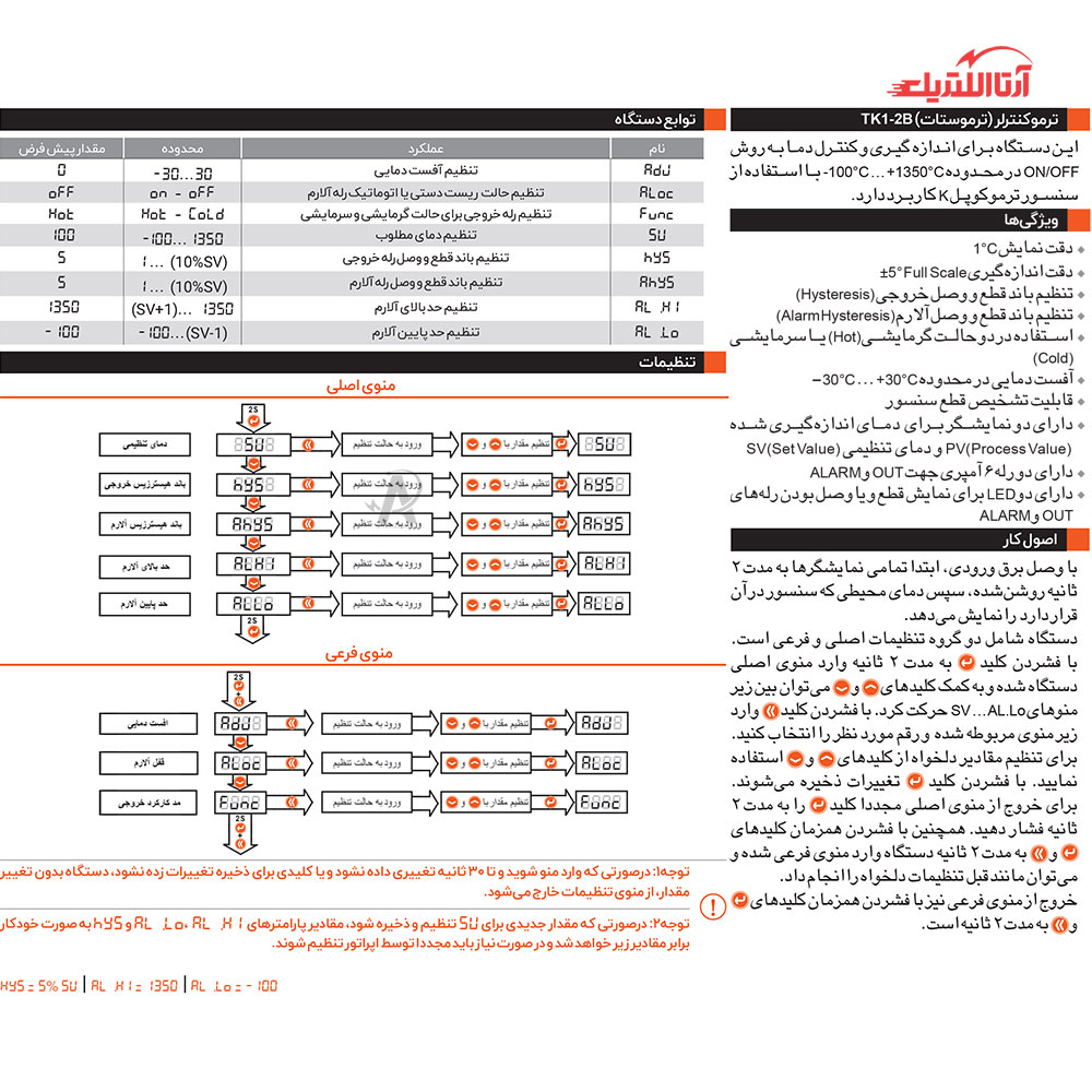 ترموستات TK1-2B یکی از محصولات برنا الکترونیک است که برای اندازه گیری و کنترل دقیق دما بـه روش OFF/ON در سیستم‌های صنعتی و کاربردهای مختلف طراحی شده است.این دستگاه با استفاده از سنسور ترموکوپــل K  قادر به اندازه‌گیری و کنترل دما در بازه 100- تا 1350+ درجه سانتی‌گراد می‌باشد. اصول کار این ترموستات به این شکل است که با اتصال برق ورودی، نمایشگر به مدت 2 ثانیه به‌طور کامل روشن می‌شود و سپس دمای محیطی که سنسور در آن قرار دارد، نمایش داده می‌شود.