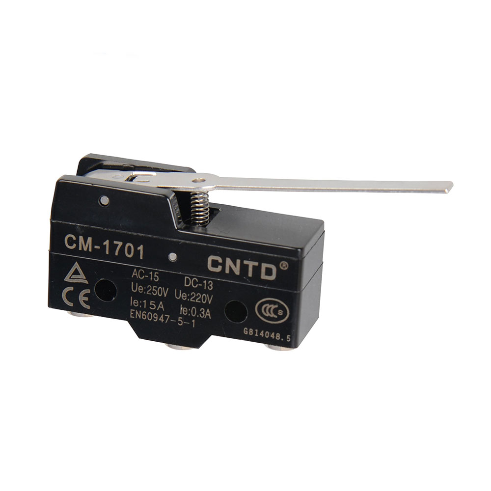 میکرو سوئیچ اهرمی قرقره دار CNTD مدل CM-1701 یک کلید الکترومکانیکی دقیق و حساس است که از طریق برخورد مکانیکی یک جسم متحرک با اهرم فنردار  آن، وضعیت مدار الکتریکی را تغییر می‌دهد و نقش مهمی در کنترل، ایمنی و تشخیص موقعیت اجسام در مدارهای صنعتی ایفا می‌کند.این میکروسوییچ نوعی کلید مکانیکی دقیق و پرکاربرد در سیستم‌های کنترلی و اتوماسیون صنعتی است که با مکانیزم فشاری مجهز به قرقره طراحی شده است. تفاوت اصلی این مدل با نسخه‌های ساده، در داشتن یک اهرم فنری همراه با قرقره در قسمت فوقانی است که باعث می‌شود فعال‌سازی آن از طریق حرکت لغزشی یا غلتشی یک قطعه مکانیکی انجام گیرد.