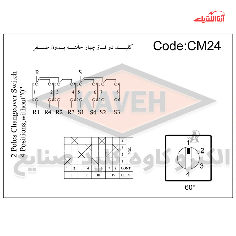 کلید سلکتوری 25 آمپر دو فاز چهار حالته بدون صفر الکترو کاوه کد CM24