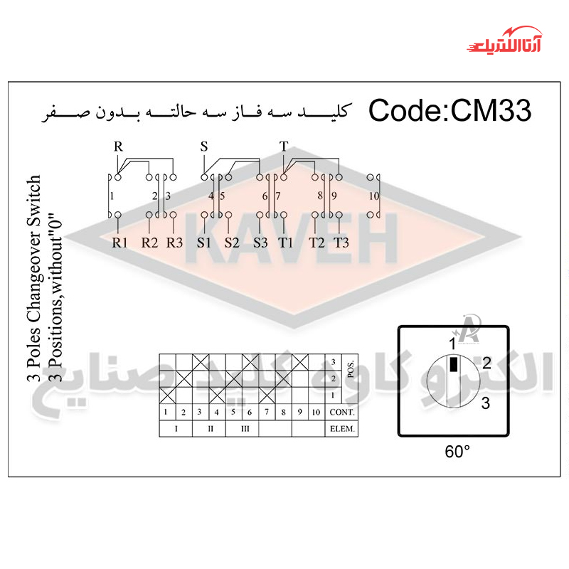 کلید سلکتوری 16 آمپر سه فاز سه حالته بدون صفر الکترو کاوه کد CM33