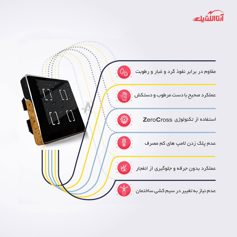 • استفاده آسان: برای روشن یا خاموش کردن دستگاه‌ها، تنها کافی است سطح کلید لمس شود.