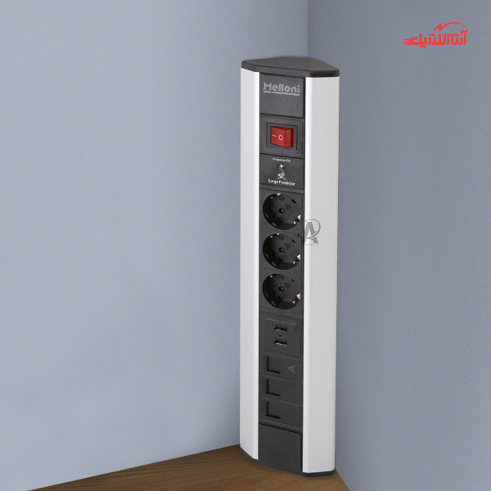 محافظ برق سه خانه کنج ملونی مدل 10050، از جمله این محصولات است که توسط مجموعه ملونی تولید می‌شود. این پریز ساختاری روکار داشته و می‌تواند در قسمت‌های مختلف منزل از جمله زیر میز، زیر کابینت دیواری، روی کابینت زمینی، روی کتابخانه و… که دارای کنج هستند، قرار بگیرد.. این محصول به رنگ طوسی-مشکی عرضه شده و برای استفاده در محیط‌های مختلف مسکونی، اداری، دانشگاه، فروشگاه و مغازه، کتابخانه و سالن مطالعه و… بسیار مناسب است. از ویژگی‌های این محصول می‌توان به اشغال فضای بسیار کم، طراحی زیبا، استفاده آسان و سریع، داشتن سیم‌کشی داخلی و تعداد پریزها و پورت‌های مناسب، اشاره کرد. پریز سه خانه ملونی، از جمله محصولات ملونی‌ست که قابلیت محافظت از لوازم برقی شما در برابر نوسانات برقی را نیز دارد. همچنین این محصول دارای پورت‌ها و پریزهای با ویژگی‌ها و تعداد زیر است.