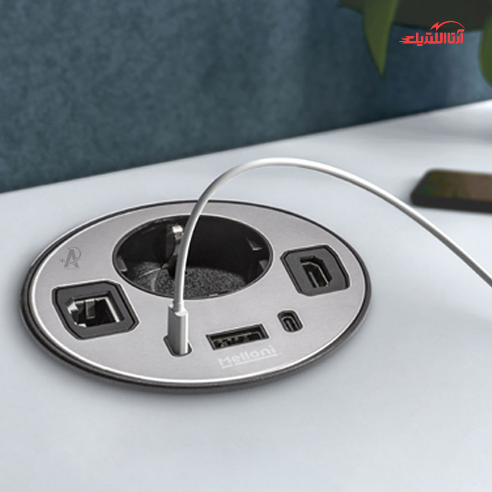 پریز توکار تک خانه ملونی مدل 10096 با طراحی گرد و مدرن، راهکاری حرفه‌ای برای مدیریت اتصالات برقی و دیتا در محیط‌های کاری و خانگی است. این محصول علاوه بر یک سوکت برق، دارای پورت‌های USB، HDMI و شبکه بوده و امکان استفاده هم‌زمان از برق و ارتباطات دیجیتال را فراهم می‌کند.
