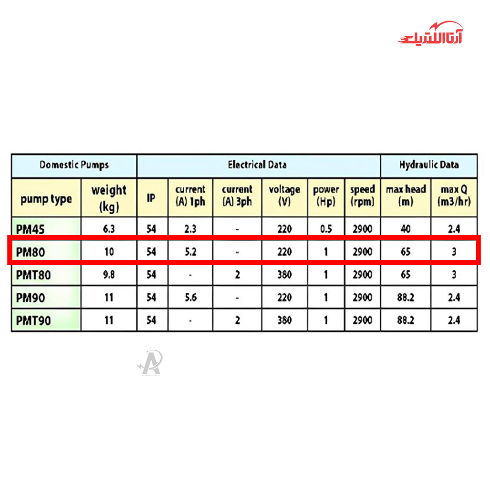 ویژگی های پمپ آب محیطی 1 اسب تکفاز نوید موتور مدل PM80