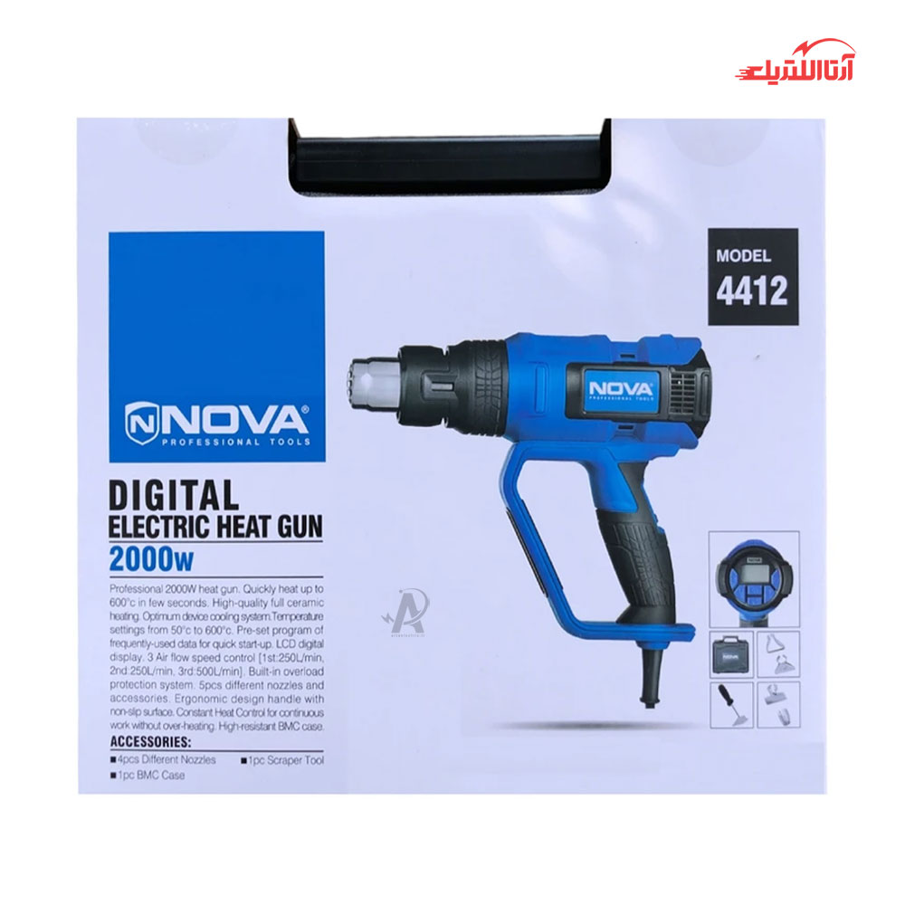 کیت سشوار صنعتی 2000 وات دیجیتال نووا کد 4412 یک دستگاه برقی است که انرژی الکتریکی را به باد گرم تبدیل میکند. برخلاف سشوارهای خانگی، سشوارهای صنعتی توان و قدرت بسیار بالاتری دارند و میتوانند دمای بسیار بیشتری تولید کنند. قابلیت دیمر در این محصول، به شما امکان میدهد دمای هوای خروجی را به صورت دقیق تنظیم کنید. این ویژگی به خصوص برای کارهایی که نیاز به کنترل دقیق دما دارند، بسیار مفید است. قابلیت تنظیم میزان حجم خروجی هوا در سه وضعیت بین 250 تا 500 لیتر در دقیقه به کاربر اجازه میدهد با توجه به نیاز خود، یکی از این سه حالت را انتخاب کند. برای مثال، برای کارهای ظریف و حساس، میتوان از کمترین میزان هوا استفاده کرد و برای کارهای سنگینتر، میتوان از بیشترین میزان هوا استفاده کرد. طراحی ارگونومیک بدنه و وزن سبک این سشوار صنعتی باعث فعالیت طولانی مدت بدون خستگی در کاربر میشود. سیستم تنظیم دما و فشار باد دیجیتال یک فناوری پیشرفته در این محصول است که به منظور کنترل دقیق و خودکار دما و فشار استفاده میشود.