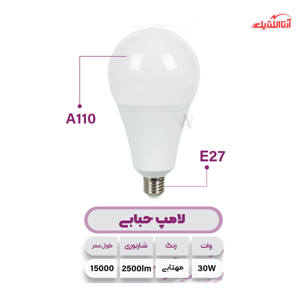 لامپ 30 وات حبابی ای ال ای دی پارس شوان پایه E27، محصولی فوق کم مصرف با رده انرژی A+ است. اندازه سرپیچ این محصول E27 (سرپیچ معمولی) است و مناسب مصارف خانگی، اداری، روشنایی کارگاه، مغازه و متراژهای بالا است. در ساخت این محصول از تکنولوژی LED SMD استفاده شده است. محصولات پارس شوان ساخت ایران و دارای علامت استاندارد هستند. لامپ پارس شوان با طول عمر تقریبی 30000 ساعت در دو رنگ نور آفتابی و مهتابی قابل سفارش است. بهرهوری لامپ این لامپ بسیار بالا، فاقد اثر حرارتی و اشعههای مضر برای سلامتی و سازگار با محیط زیست است.