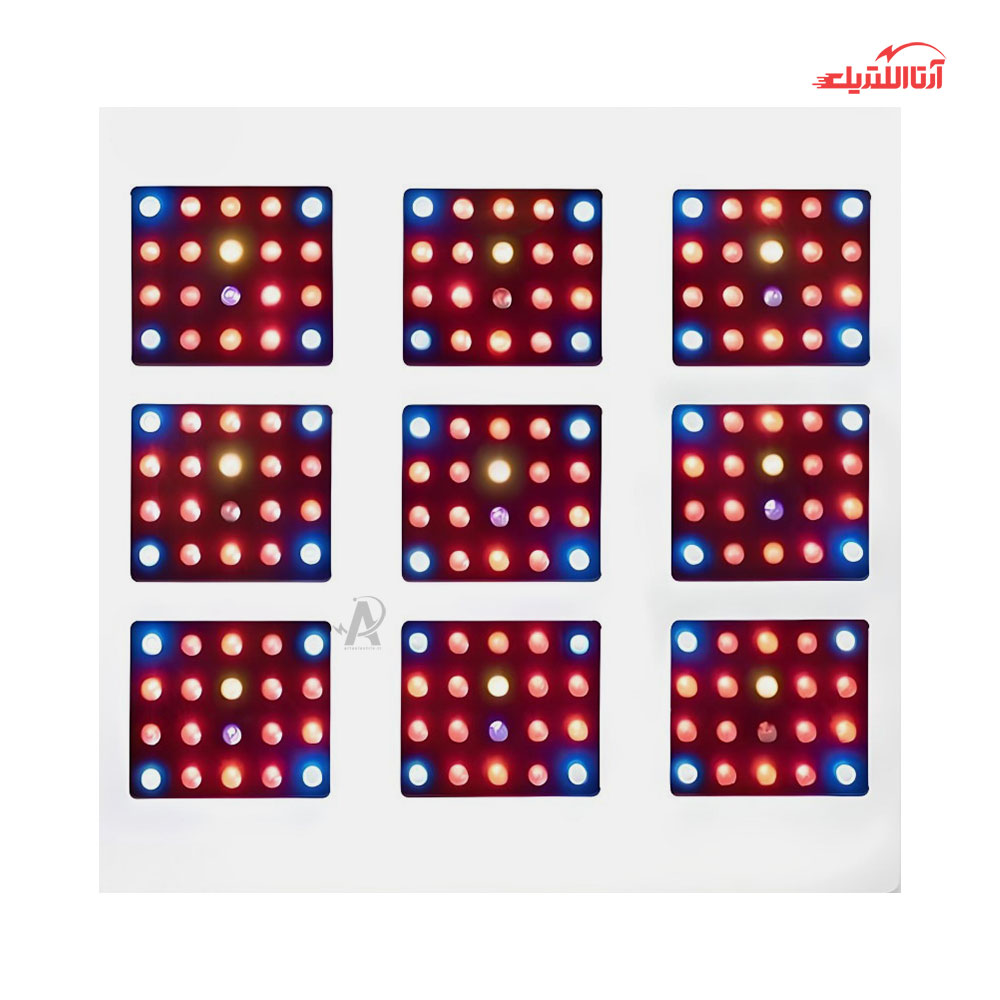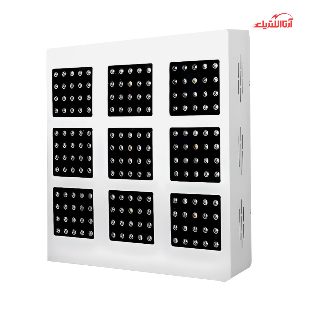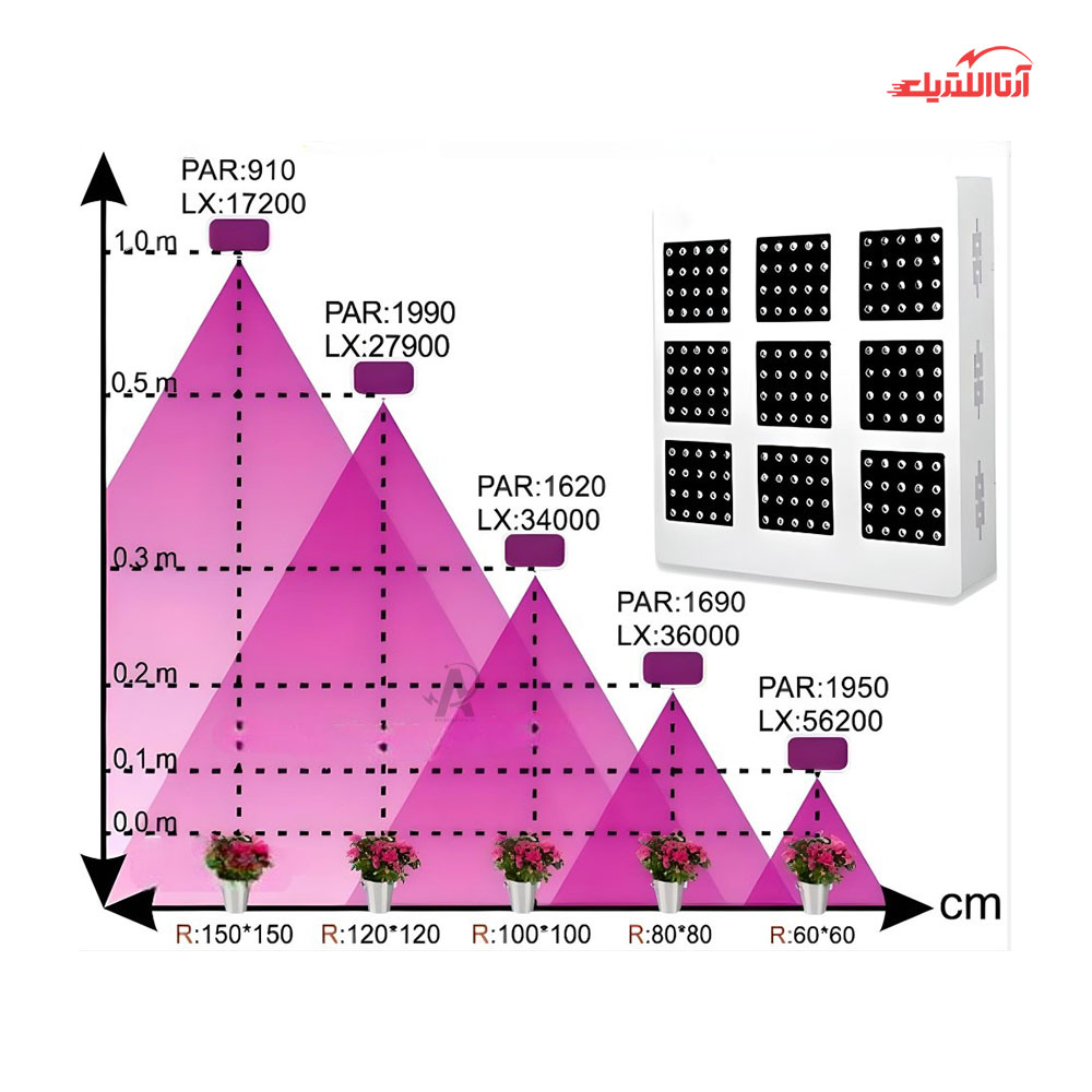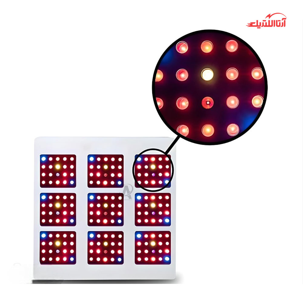 پروژکتور رشد گیاه 480 وات فول اسپکتروم با نوردهی 90 لومن بر وات که در مجموع 48600 لومن نور در طیف 380 تا 750 نانومتر با ترکیبی از 2300 تا 6500 کلوین با طول عمر 60 هزار ساعت است. در تولید این چراغ از بهترین مارکهای نوع LED از رنگ نورهای قرمز و آبی ساخته شده تا بهترین بهرهنوری را ساطع کند. سطح تحت پوشش چراغ 120X120 سانتیمتر مربع است و برای نصب باید فاصله را از تاج گل محاسبه کرد که معمولا ارتفاع نصب با توجه به تعداد گیاه از 50 سانتیمتر در نظر گرفته میشود. محصولات رشد گیاه دارای درجه حفاظت IP برای جلوگیری از نفوذ رطوبت و گردوخاک و با استاندارد IR تولید میٰشوند که نشان از عدم تولید گرماست که برای گیاه مضرر است.