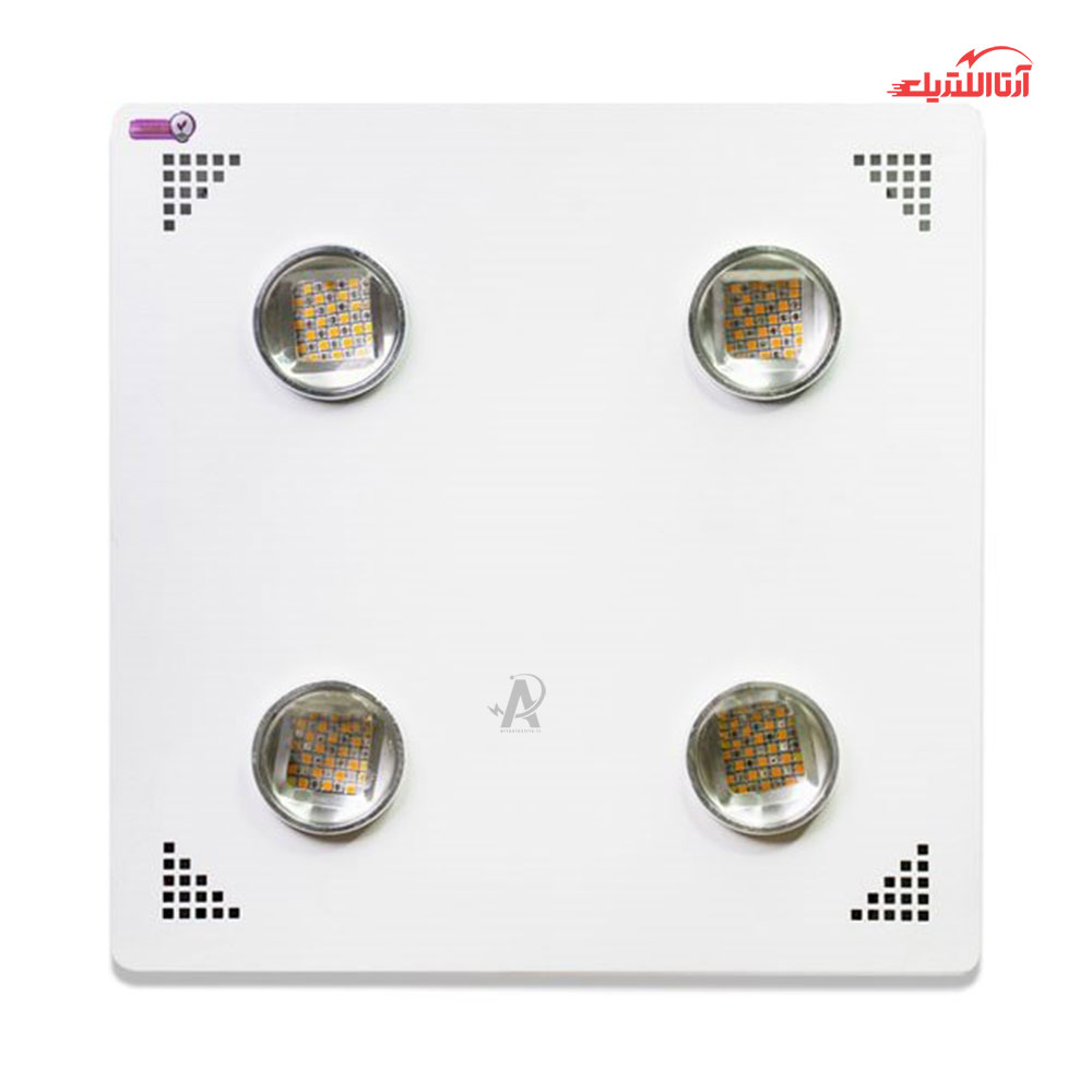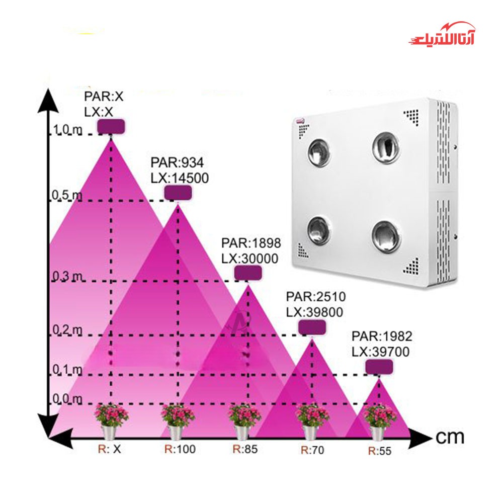 پروژکتور رشد گیاه 400 وات مولتی چیپ با نوردهی 81 لومن بر وات که در مجموع 32400 لومن نور در طیف 380 تا 750 نانومتر با ترکیبی از 2300 تا 6500 کلوین با طول عمر 50 هزار ساعت است. در تولید این چراغ از بهترین مارکهای نوع LED از رنگ نورهای قرمز و آبی ساخته شده تا بهترین بهرهنوری را ساطع کند. سطح تحت پوشش چراغ 120X120 سانتیمتر مربع است و برای نصب باید فاصله را از تاج گل محاسبه کرد که معمولا ارتفاع نصب با توجه به تعداد گیاه از 60 سانتیمتر در نظر گرفته میشود. محصولات رشد گیاه دارای درجه حفاظت IP برای جلوگیری از نفوذ رطوبت و گردوخاک و با استاندارد IR تولید میٰشوند که نشان از عدم تولید گرماست که برای گیاه مضرر است.