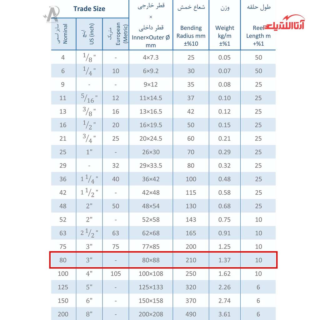 لوله فلکسی سایز 80 رهورد خراسان تیپ FC1، یکی از این محصولات است که برای محافظت از انواع سیم و کابل در تاسیسات الکتریکی، سیستم‌های روشنایی، فیبرهای نوری، سیم و کابل‌های موجود در ماشین‌آلات و تجهیزات کارخانه‌ها، سیستم‌های مدار بسته و… کاربرد دارد. قسمت فلزی این محصول، ترکیبی از ورق گالوانیزه (استاندارد EN-10346)، ورق استیل ضدزنگ آنتی‌مگنتیک (استاندارد AISI 304/316) و ورق آلومینیوم (استاندارد DIN-1784) بوده و روکش ندارد. دمای کاری لوله فلکسی رهورد خراسان، از منفی 45 تا مثبت 300 درجه سانتی‌گراد بوده و دارای درجه حفاظت IP40 است.