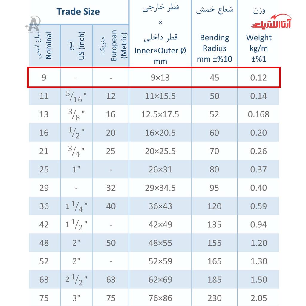 | سایز اسمی | 9 |