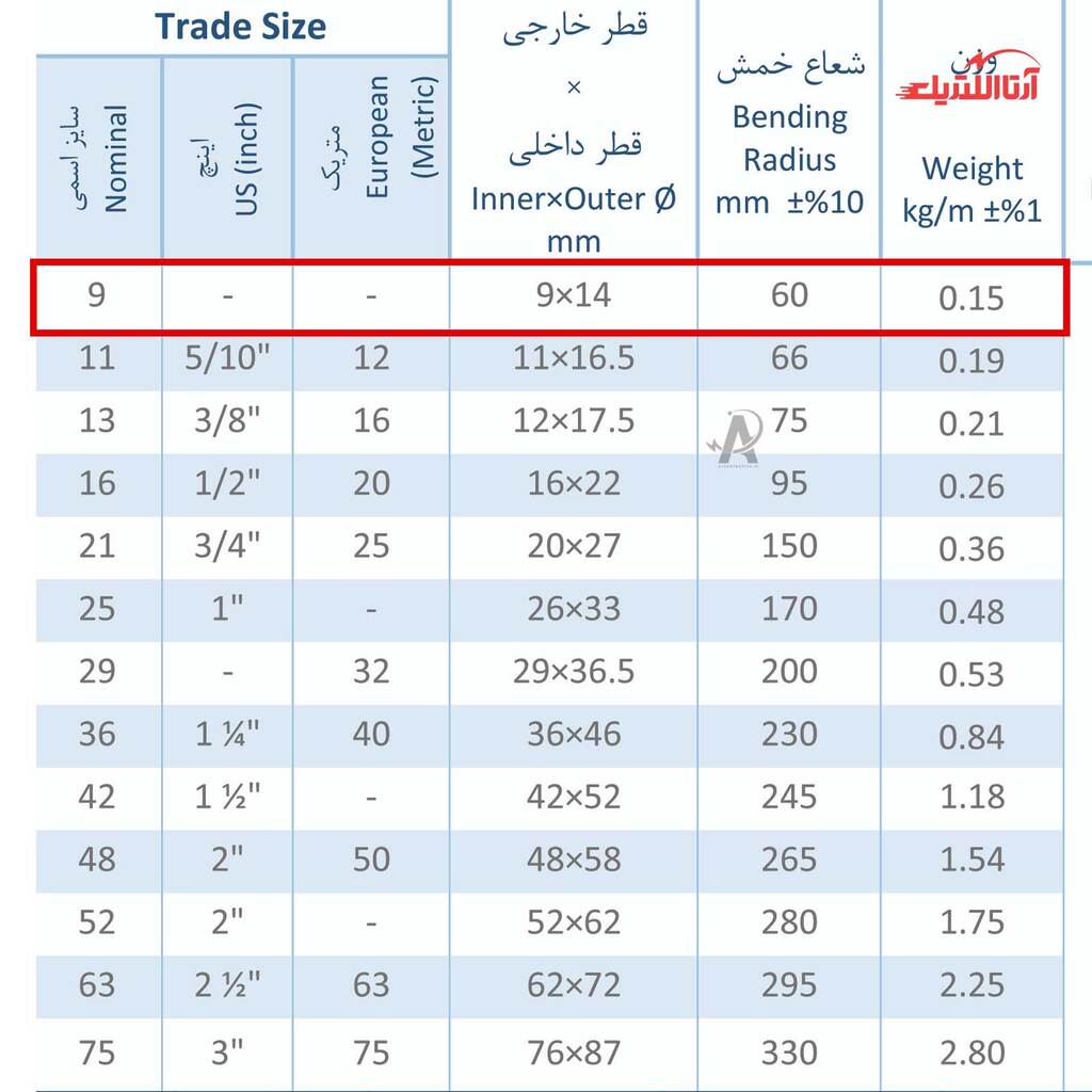 | سایز اسمی | 9 |