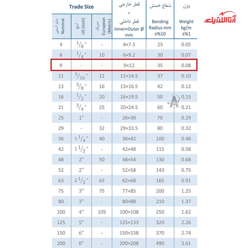 | سایز اسمی | 9 |