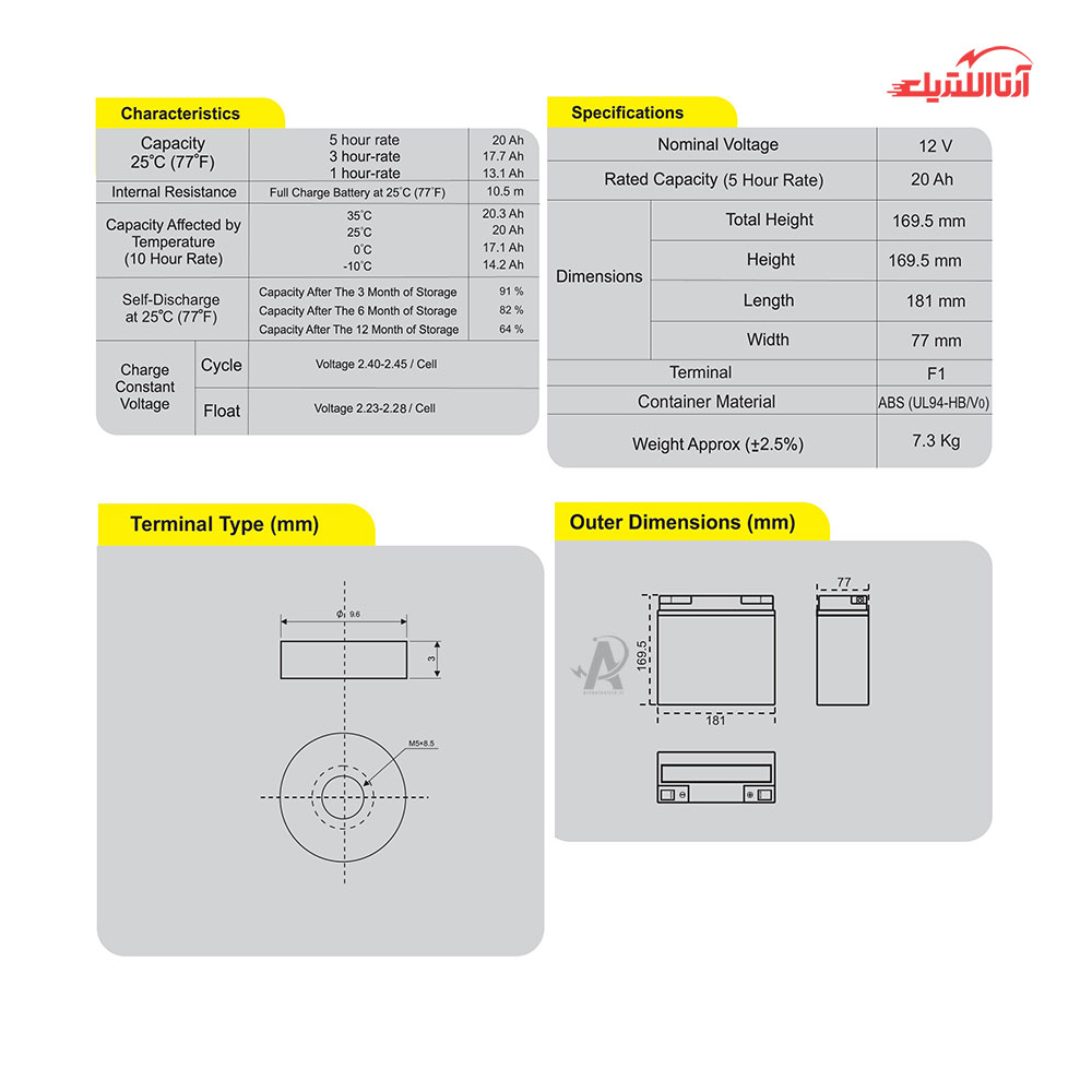 باتری یو پی اس 12 ولت 20 آمپر صبا باتری، برای دستگاههای یو پی اس استفاده میشود. این دستگاهها وقتی برق قطع میشود، به کمک باتری کار میکنند تا وسایل برقی مهم شما خاموش نشوند. باتری های 12 ولت یو پی اس صبا باتری با بهرهگیری از تکنولوژی پیشرفته VRLA و مطابق با استانداردهای جهانی تولید میشوند. در قلب این باتری قدرتمند، صفحات سربی قرار دارند که با واکنش شیمیایی با الکترولیت، انرژی الکتریکی مورد نیاز را تولید میکنند. این صفحات، همانند سلولهای خورشیدی، انرژی شیمیایی را به انرژی الکتریکی تبدیل کرده و دستگاههای متصل به یو پی اس را در زمان قطع برق تغذیه میکنند. بدنه این دستگاه از ABS ساخته شده است که در برابر ضربه و فشارهای فیزیکی مقاومت بالایی از خود نشان میدهد. این ویژگی به ویژه در محیطهایی که باتری UPS در معرض لرزش یا ضربههای احتمالی قرار دارد، بسیار اهمیت دارد.