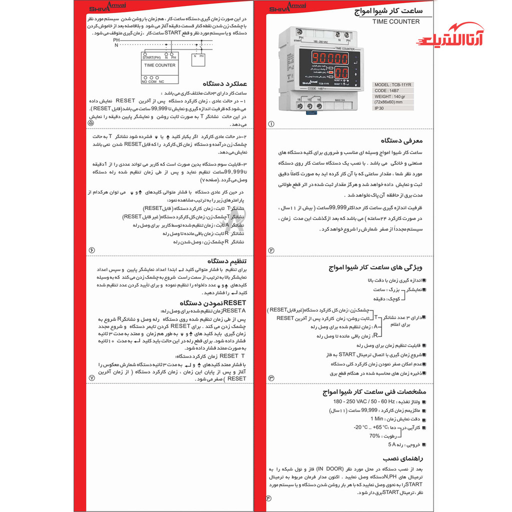 ساعت کار با رله خروجی قابل تنظیم سری N مدل TCJN-5Y کد 14JN7 شیوا امواج وسیله‌ای مناسب و ضروری برای کلیه دستگاه‌های صنعتی و خانگی است. با نصب یک دستگاه ساعت کار روی دستگاه مورد نظر شما، مقدار ساعتی که با آن کار کرده‌اید به صورت کاملاً دقیقِ ثبت و نمایش داده خواهد‌شد و هرگز مقدار ثبت‌شده در اثر قطع طولانی مدت برق از حافظه آن پاک نخواهد‌شد. ظرفیت اندازه‌گیری ساعت کار حداکثر ۹۹,۹۹۹ ساعت ( بیش از ۱۱سال، در صورت کارکرد ۲۴ ساعته ) است که بعد از گذشت این مدت زمان، سیستم مجدداً از صفر شمارش را شروع خواهد‌کرد.