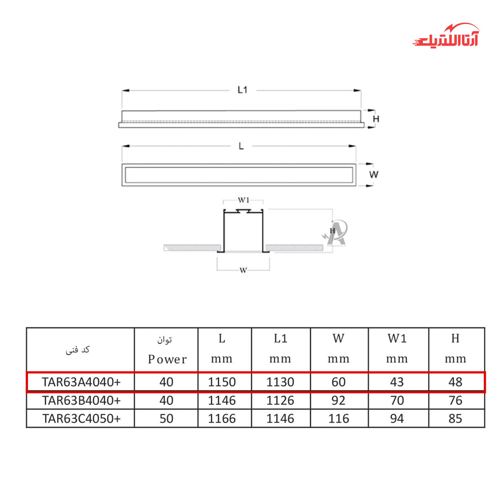 چراغ خطی توکار 40 وات تولید نور مدل لوین پلاس کد TAR63A4040+