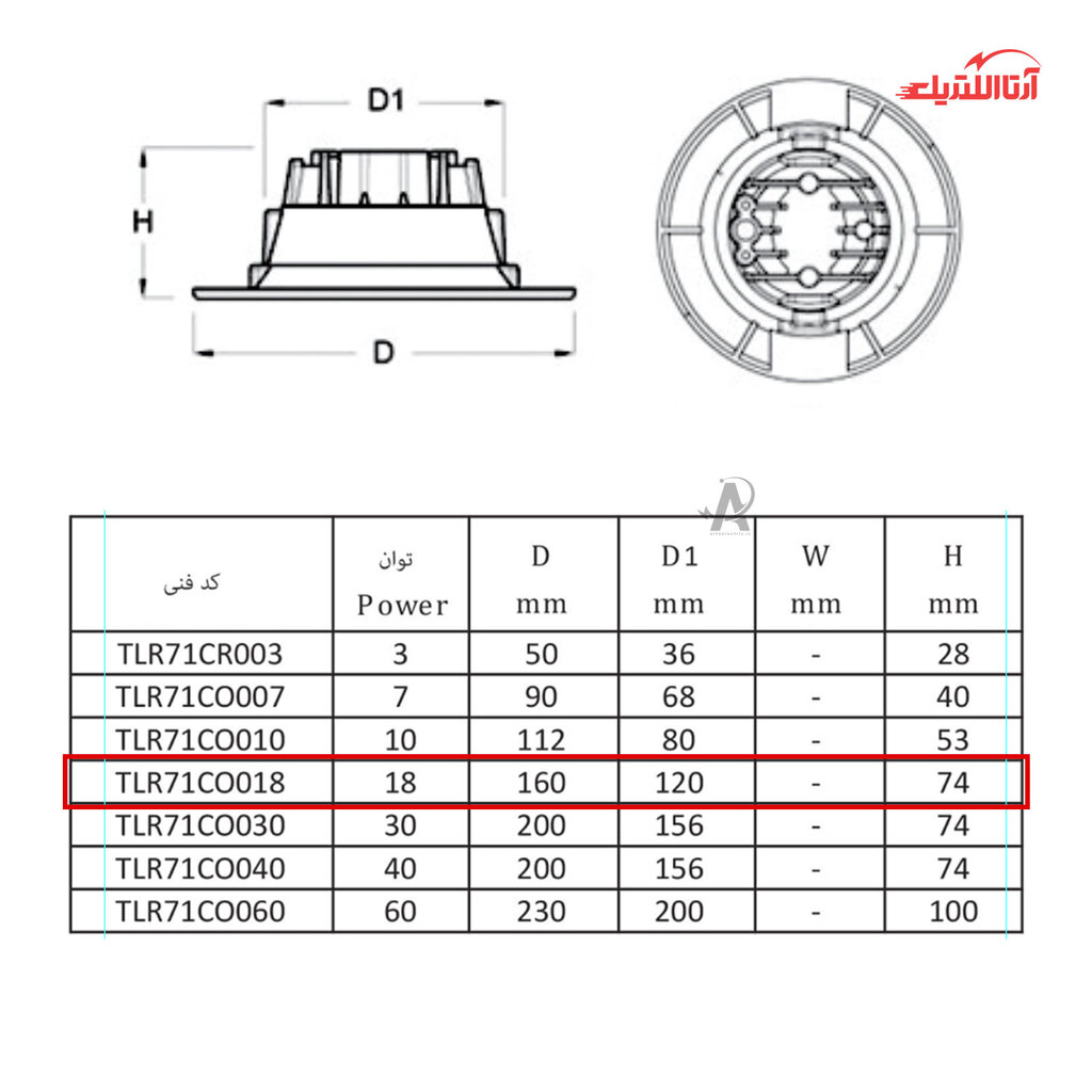 چراغ سقفی توکار 18 وات COB تولید نور مدل سان لایت کد TLR71CO018