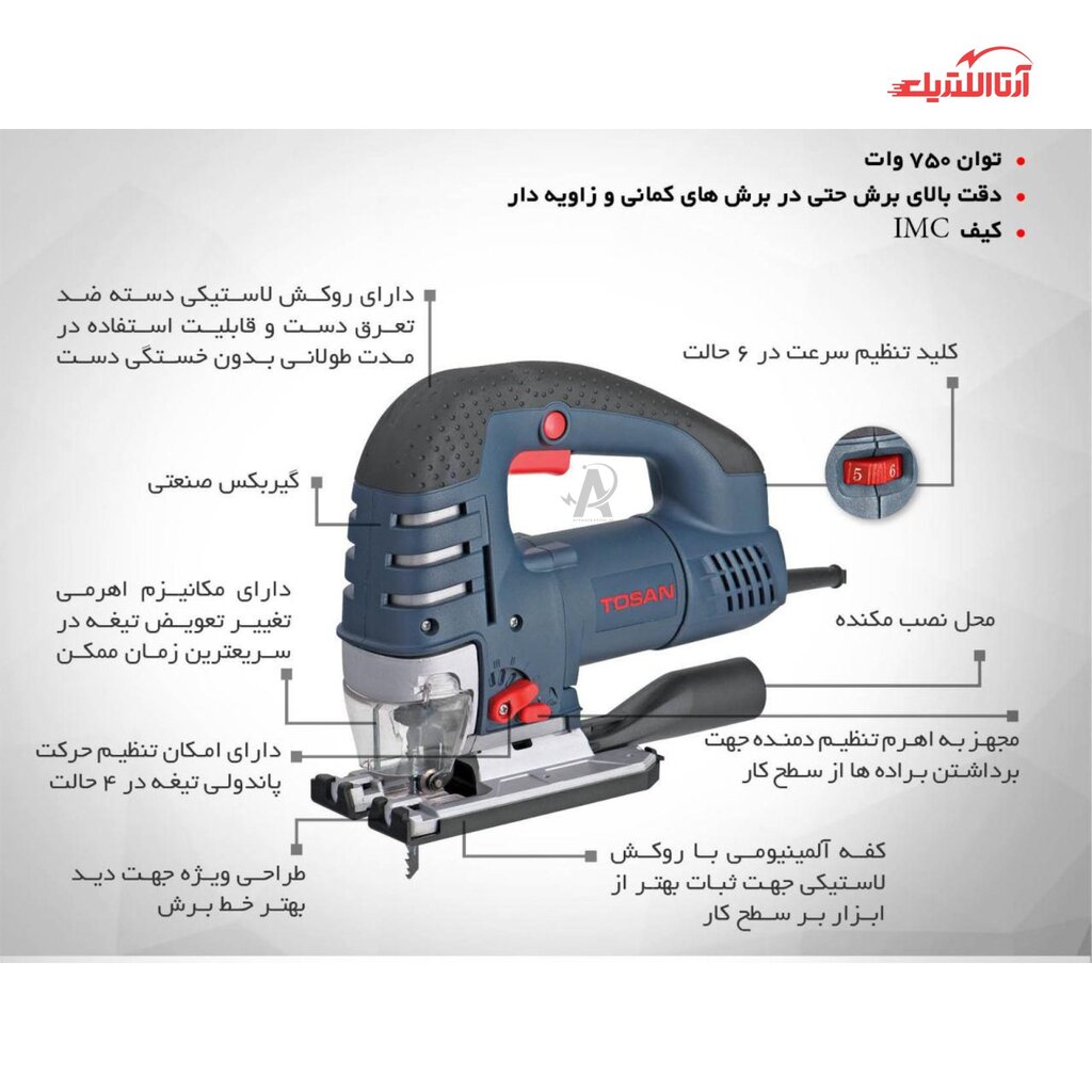 اره عمود بر توسن مدل 5750j با توان 750 وات, مجهز به کنترل کننده سرعت 6 حالته الکترونیکی (دیمر) برای کنترل سرعت برش است. عمود بر صنعتی توسن با موتور پر قدرت و گیربکس آلومینیومی، امکان برش دقیق و سریع را میسر ساخته است. سیستم گیربکس متوازن این دستگاه با کاهش لرزش حین برش و جلوگیری از انتقال لرزش به کاربر, موجب افزایش رضایت مصرف کننده گردیده است. به منظور برش انواع چوب و فلزات, امکان تنظیم حرکت پاندولی تیغه در 4 حالت وجود دارد. این اره عمود بر به خاطر سهولت در کار مدام با ابزار به شستی قفل کن کلید برق مجهز است و کلید برق آن در برابر گرد و غبار مقاوم است. این ابزار به کفه آلومینویومی قابل تنظیم با روکش لاستیکی جهت ثبات بهتر دستگاه تجهیز است; کفه را میتوان در زوایای درجه تنظیم نمود.