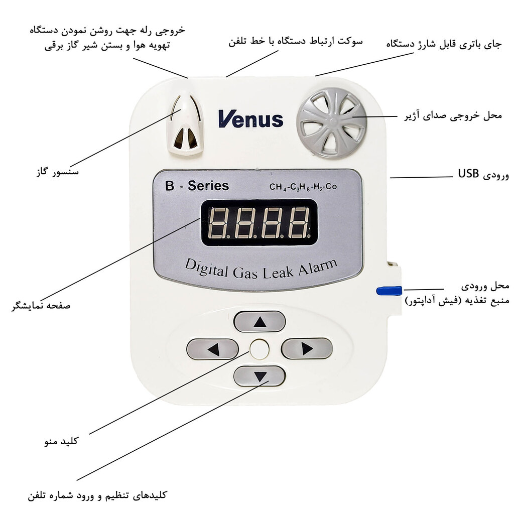 سنسور نشت گاز ونوس مدل B قابلیت تشخیص گازهای مونو اکسید کربن، دی اکسید کربن، گازهای قابل اشتعال شهری و کپسول را دارد. این دستگاه به منظور حفظ ایمنی محیطهای مسکونی و اداری جهت نشت گازهای خطرناک طراحی شده است. سنسور نشت گاز با تشخیص مونوکسید کربن و گاز شهری در محیط، با هشداردهندههای صوتی و نوری ساکنین را از خطر آگاه میکند. همان گونه که در شکل مشخص است، دستگاه دارای یک نمایشگر دیجیتال است که میزان آلودگی محیط را نشان میدهد. کاربرد عمده محصول در فصل پاییز و زمستان است که استفاده از تجهیزات گرمایشی بسیار بیشتر است. سنسور ونوس را میتوان برای تشخیص گاز مونو اکسید کربن دستگاههای حرارت مرکزی، بخاری، آب گرمکن، اجاق گاز، گاز خودرو و… استفاده کرد.